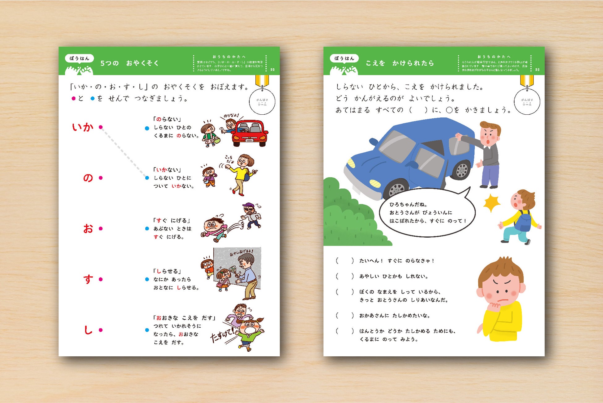 「知らない人とは」「いかのおすし」「声をかけられたときの対応」「危険な場所」「身を守る備え」など、ひとりのときに注意したい防犯について学びます。