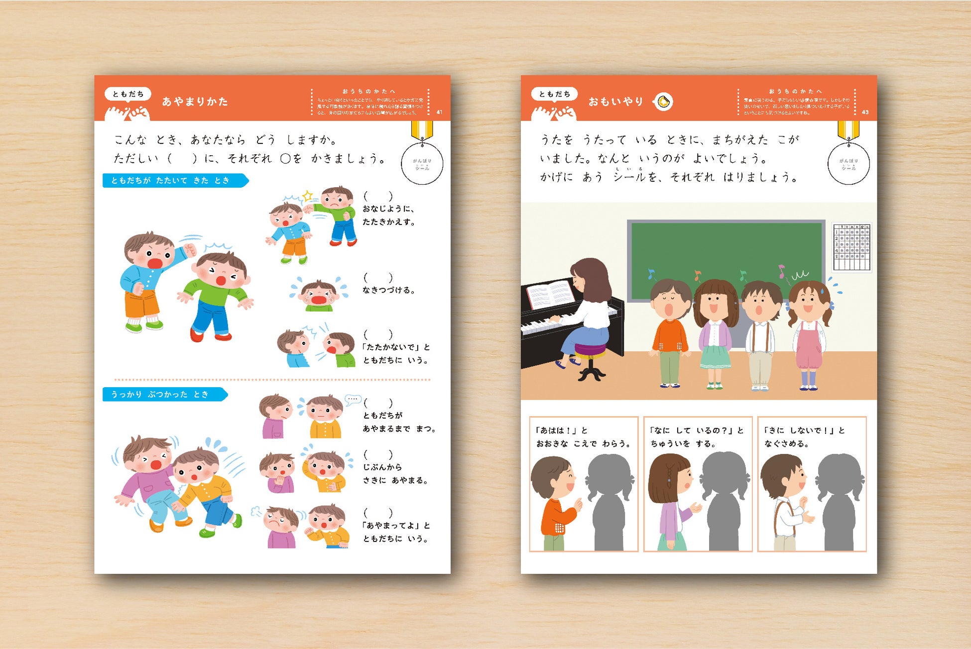 「話の聞き方」「謝り方」「物の貸し借り」「思いやり」「自分の気持ち」「友だちの気持ち」「みんなの気持ち」など、友だちと仲よく過ごす方法や自分の思いを伝える方法を学びます。