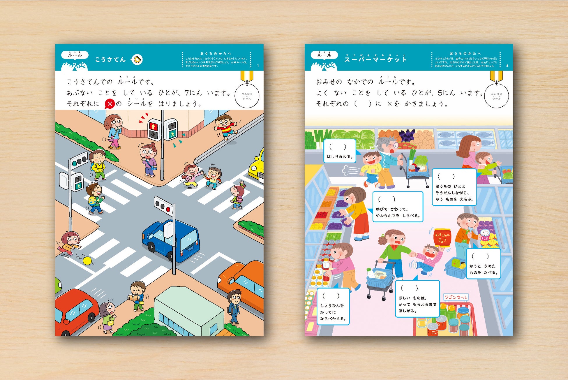最初は身近なルールやマナーから、実生活に結びついた応用問題へ!「ルール」「マナー」「防犯」「防災」「友だち」「おやくそく」の6つのテーマを学習します。