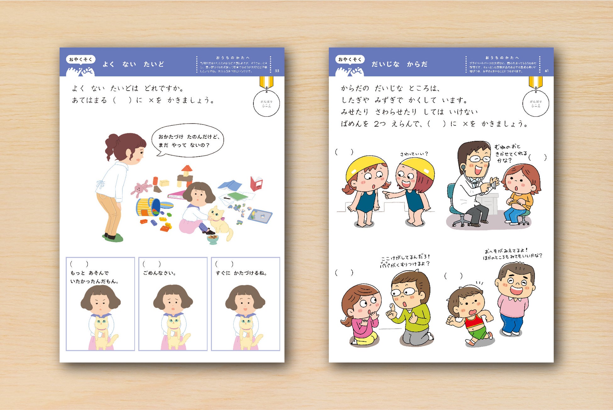 「迷子になったときの行動」「よくない態度」「親切な行動」「うそ」「テレビやゲームのおやくそく」「プライベートパーツ」「危ない行動」「危険な物」「大切な人」など、ご家庭で話し合いたい内容を厳選しました。
