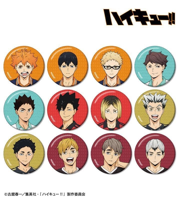 日向翔陽、影山飛雄、月島 蛍、及川 徹、岩泉 一、黒尾鉄朗、孤爪研磨、木兎光太郎、赤葦京治、宮 侑、宮 治、北 信介のビジュアルをグリッター加工を施した缶バッジに仕上げました。