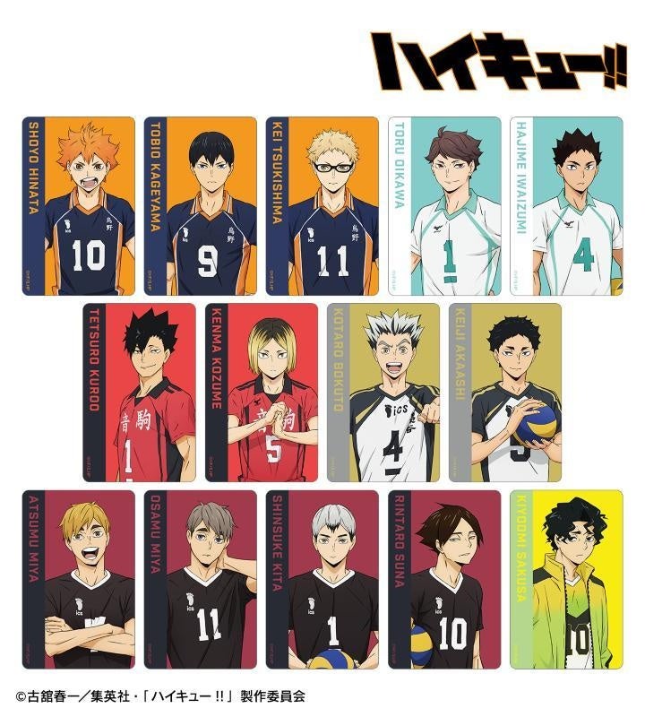 日向翔陽、影山飛雄、月島 蛍、及川 徹、岩泉 一、黒尾鉄朗、孤爪研磨、木兎光太郎、赤葦京治、宮 侑、宮 治、北 信介、角名倫太郎、佐久早聖臣のビジュアルをプラスチックカードに仕上げました。