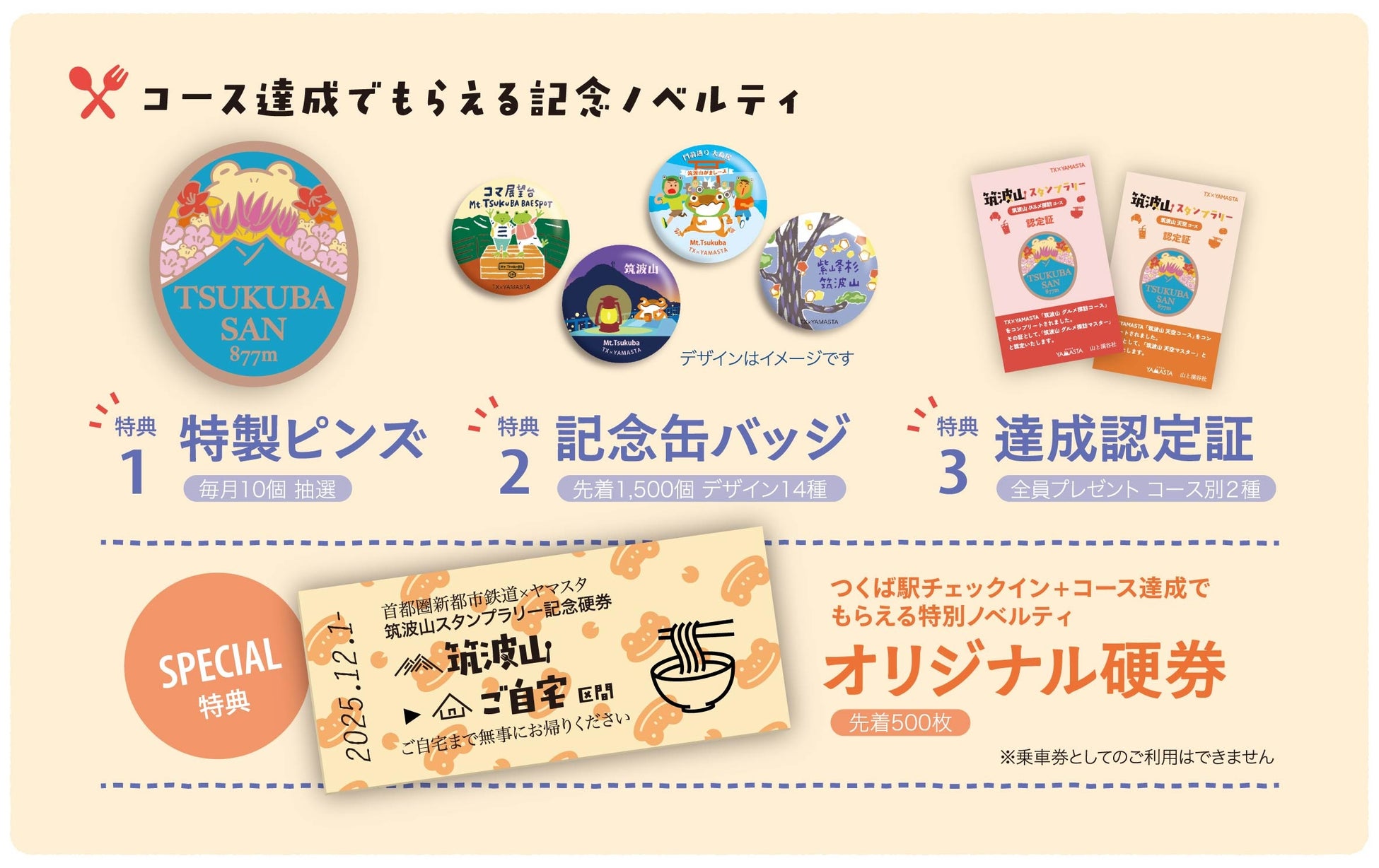 スタンプラリーを達成すると、先着や抽選でオリジナル特典がもらえます。さらに、スペシャルチェックインポイントでスタンプを獲得して条件を満たすと、人気ノベルティの「オリジナル硬券」をプレゼント! 筑波山の思い出と一緒に、ぜひお持ちカエリください。