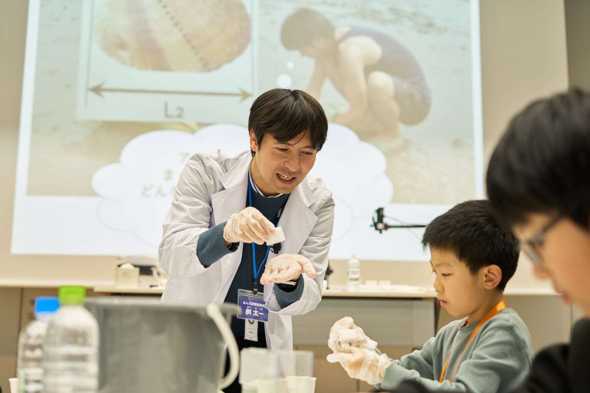 学研の科学特別研究員・桝太一さん(同志社大学 助教)が行った特別ワークショップでは、桝さんが東京大学在学中に実際に研究していたアサリの実験を子どもたちが体験。透明樹脂に埋まったアサリの貝殻断面をみがき、その成長線を観察しました。日ごとに増える成長線は10倍ルーペでやっと観察できる微細さ。今回、特別サポートとして、日本貝類学会会長の大越健嗣先生とその教え子の研究者が参加して、アサリの成長線についてくわしく解説していただきました。本物の研究者に出会える経験は、対面式のイベントならでは。