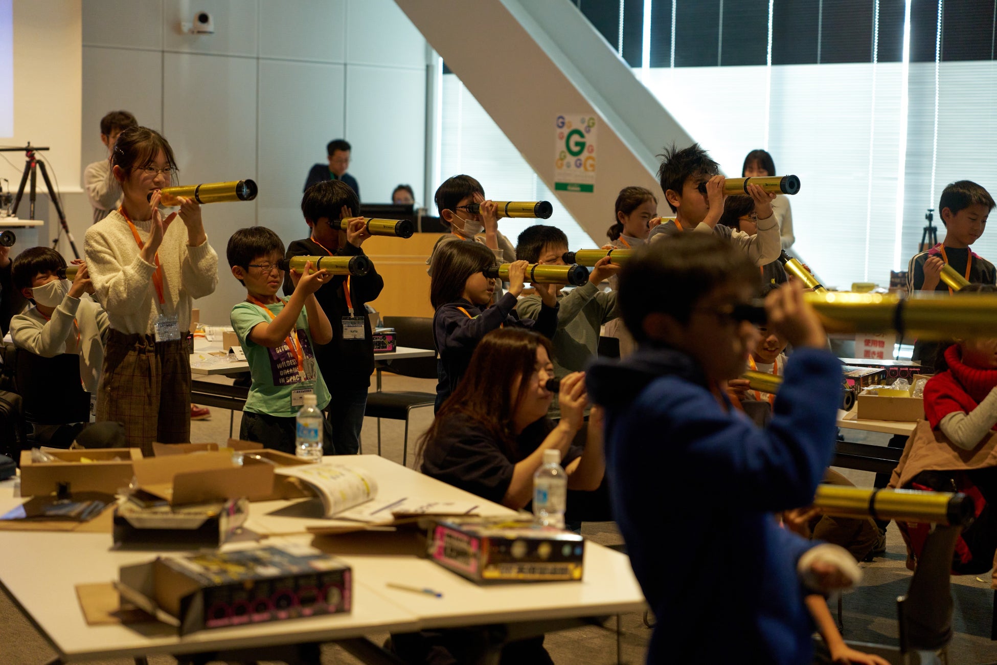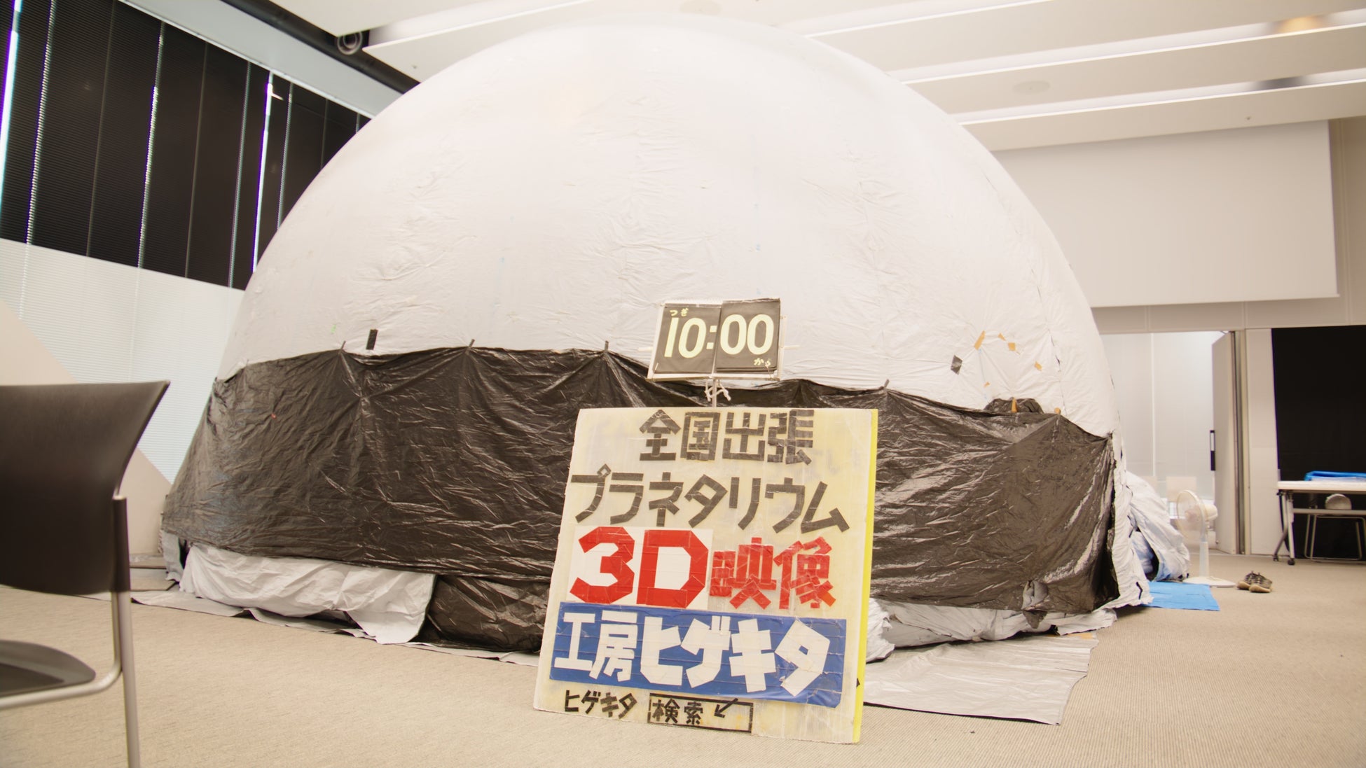 石川県金沢市在住の工作作家・ヒゲキタさんによる「手作り巨大プラネタリウム」が登場。約6,000個の星を投影するドームが会場に設置され、子どもたちは冬の星座を探しながら、天体への興味関心を深めました。さらに、ヒゲキタさんオリジナルの全天周3D映像が実演されて、ドームの中では赤青メガネをかけた子どもたちの歓声が響き渡りました。