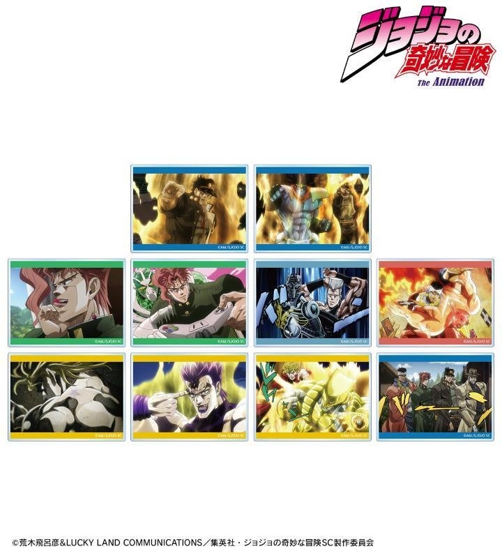 空条承太郎、スタープラチナ、花京院典明、ハイエロファントグリーン、ジャン・ピエール・ポルナレフ、シルバーチャリオッツ、モハメド・アヴドゥル、マジシャンズレッド、DIO、ザ・ワールド、ジョセフ・ジョースターの印象的なシーンをアクリルカードに仕上げました。