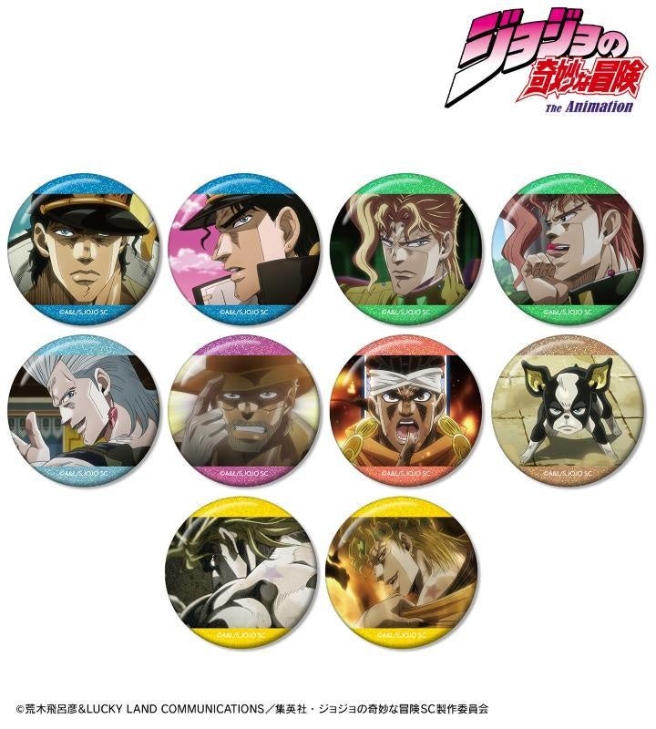 空条承太郎、花京院典明、ジャン・ピエール・ポルナレフ、ジョセフ・ジョースター、モハメド・アヴドゥル、イギー、DIOの印象的なシーンをホログラム加工を施した缶バッジに仕上げました。