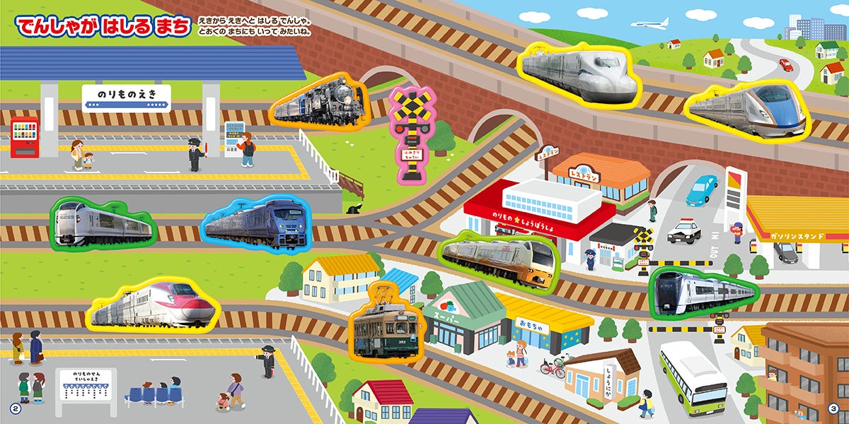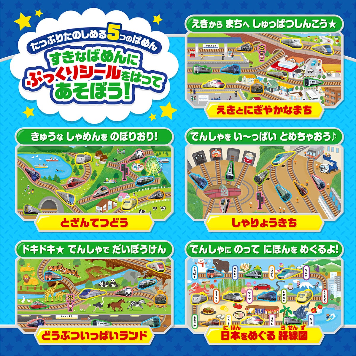 でんしゃシールは、ブックに描かれた5つの場面にはって遊ぶことができます。