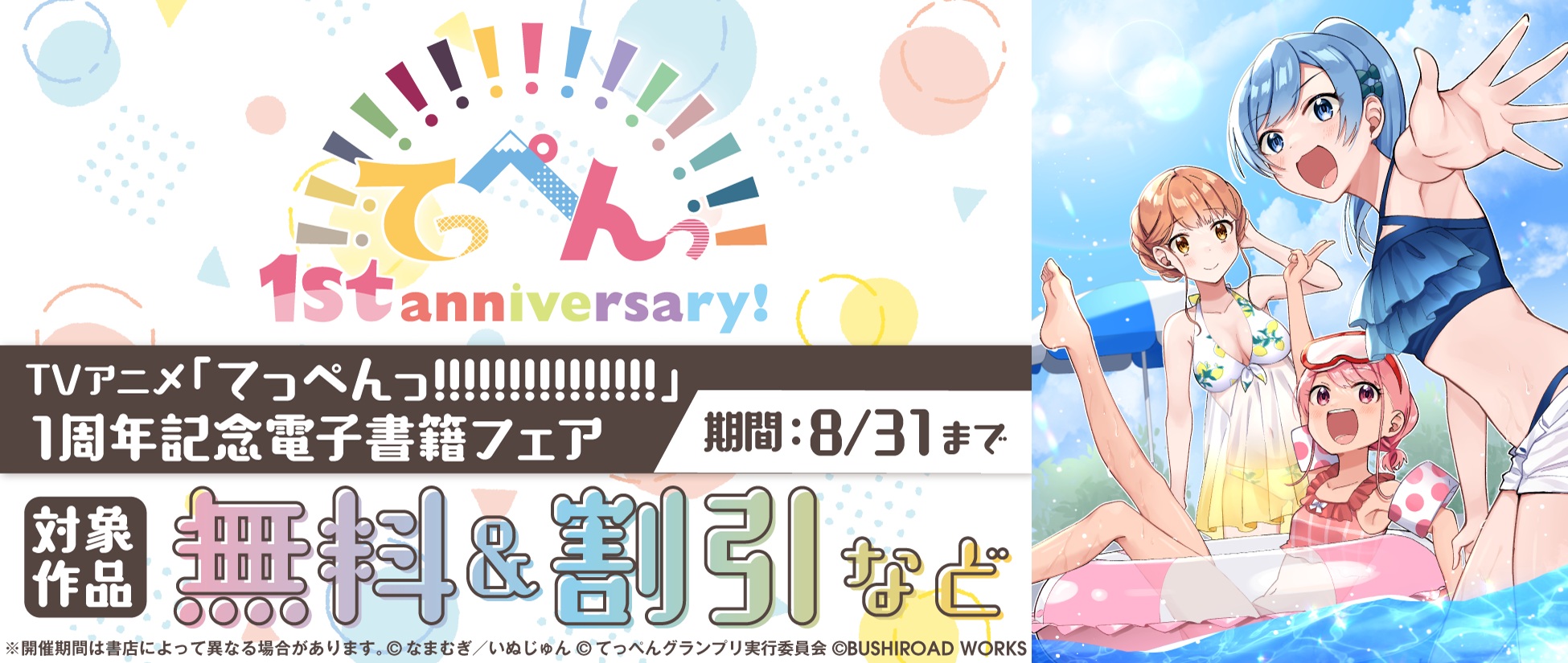 TVアニメ「てっぺんっ!!!!!!!!!!!!!!!」放送1周年を記念し、本日8月18日(金)より関連作品がお得に読める電子書籍フェア開始!!