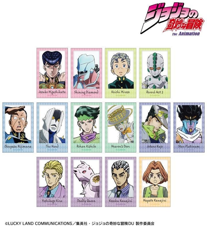 東方仗助、クレイジー・ダイヤモンド、広瀬康一、エコーズACT3、虹村億泰、ザ・ハンド、岸辺露伴、ヘブンズ・ドアー、空条承太郎、スタープラチナ、吉良吉影、キラークイーン、川尻浩作の印象的なシーンをアクリルカードに仕上げました。