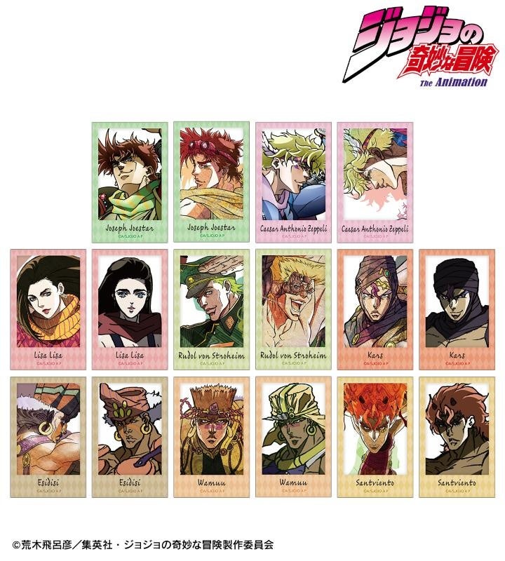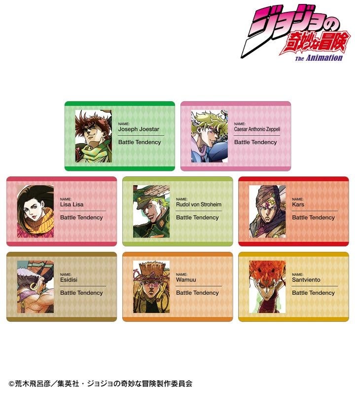 ジョセフ・ジョースター、シーザー・A・ツェペリ、リサリサ、ルドル・フォン・シュトロハイム、カーズ、エシディシ、ワムウ、サンタナのイラスト、キャラクターの名前をプラスチックカードに仕上げました。