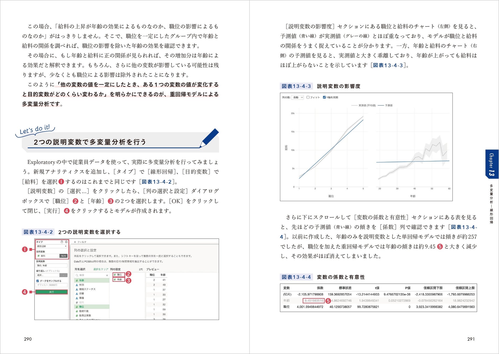 具体的には、「平均」「標準偏差」といった基礎的な記述統計から、「t検定」「ANOVA検定」などの推測統計、さらにビジネスで需要の高い「線形回帰」「ロジスティック回帰」などの多変量分析、そして「決定木」「ランダムフォレスト」といった機械学習モデルまでを、Exploratoryを使ってグラフやチャートを作成しながら学んでいきます。実際にデータを可視化・分析し、結果を解釈するという一連のプロセスを体験することで、現場ですぐに使える実践的なスキルとデータリテラシーが身につく1冊となっています。