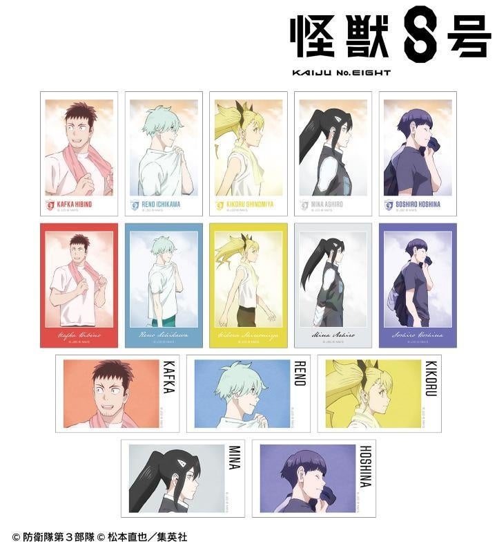 日比野カフカ、市川レノ、四ノ宮キコル、亜白ミナ、保科宗四郎の描き下ろしイラスト、キャラクターの情報をプラスチックカードに仕上げました。