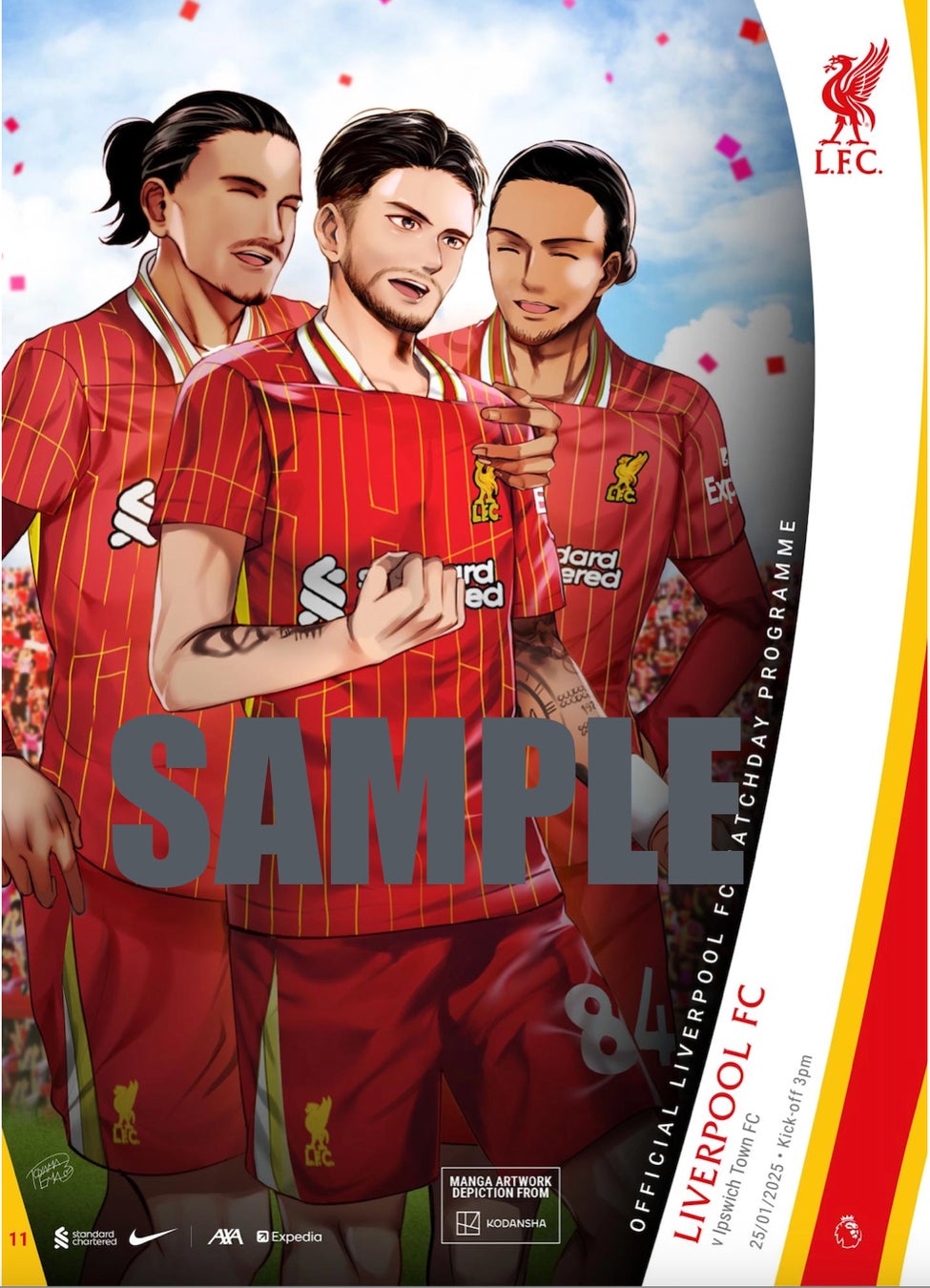ドミニク・ソボスライ選手を中心に、ヴァージル・ヴァン・ダイク選手、ダーウィン・ヌニェス選手の3人が勝利を祝うシーンを、少女漫画らしい繊細かつ華やかなタッチで表現。実際にソボスライ選手はこの試合でゴールを挙げ、現実のプレーと漫画の世界観がリンクする印象的な一幕となりました。