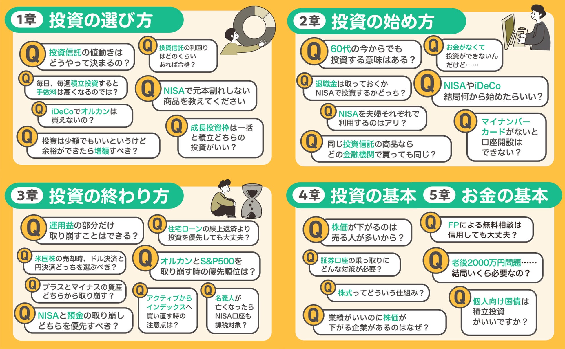 本書では、NISA・iDeCoなどの「投資の始め方」に留まらず、商品選びのポイントをまとめた「投資の選び方」、取り崩し、出口戦略の疑問を集めた「投資の終わり方」、基礎知識としての「投資の基本」や「お金の基本」と5つの章立てに分けて掲載しています。