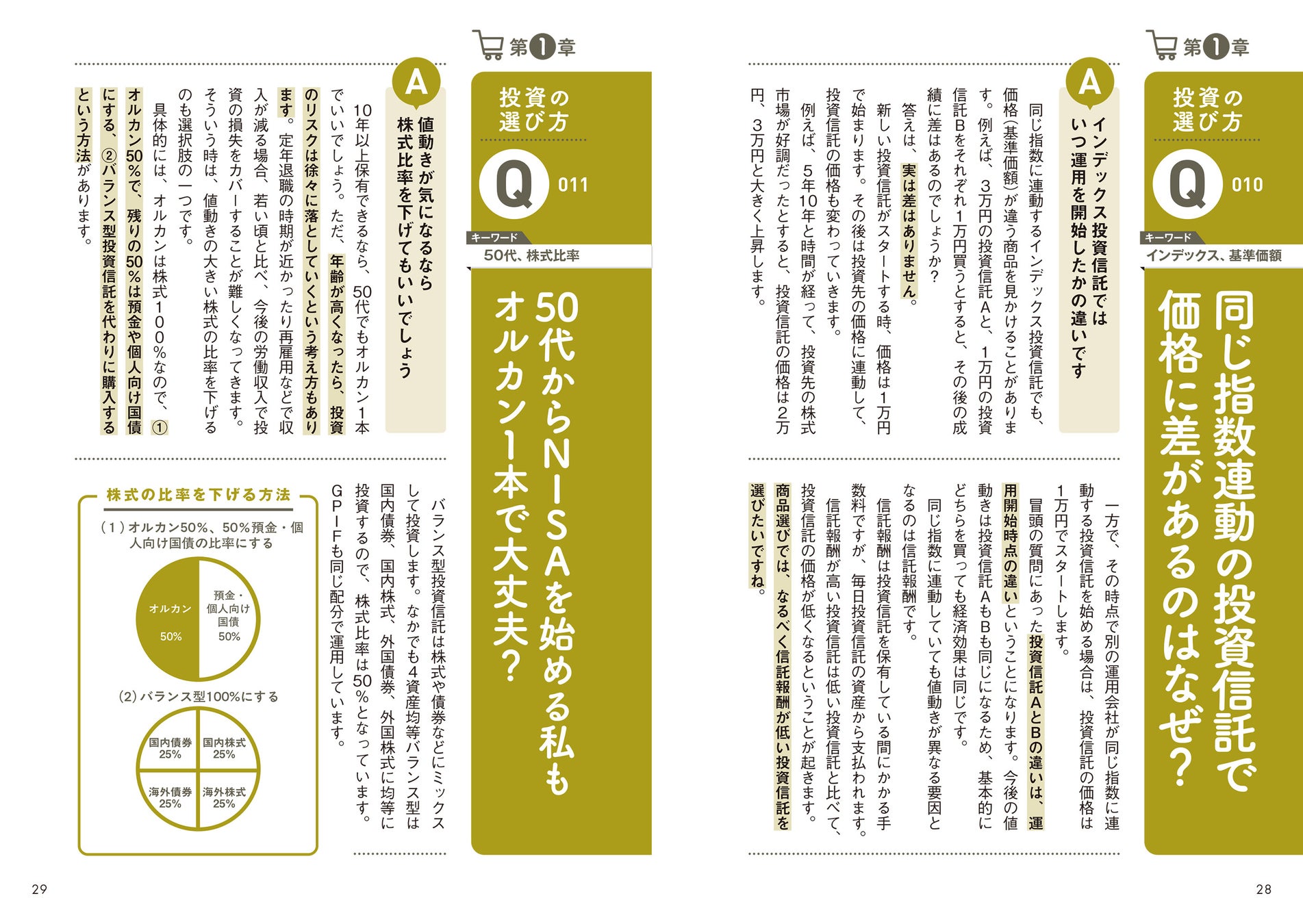 質問内容では「元本割れしない商品を教えて」「余裕ができたら投資額は増やすべき?」という普遍的な質問から、「50代だけどオルカン1本で大丈夫?」「夫婦でNISAを利用するのはアリ?」というシチュエーションを限定した質問、「投資信託の値動きはどうやって決まるの?」「つみたて投資では手数料が高くなるのでは?」という今さら聞けない質問まで、幅広い疑問に答えています。