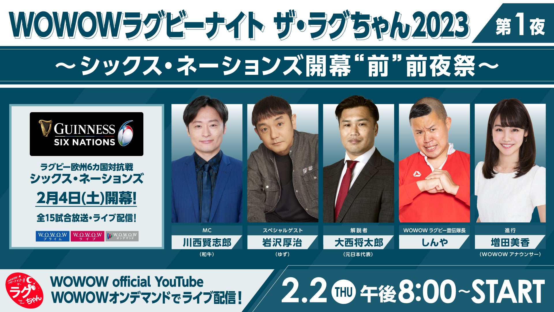 WOWOWでは恒例のライブ配信イベント「WOWOWラグビーナイト ザ・ラグちゃん2023 第1夜 ~シックス・ネーションズ開幕“前”前夜祭~」の開催が決定!2月2日(木)午後8時からWOWOWオフィシャルYouTubeとWOWOWオンデマンドでライブ配信する。なお、今回は番組史上初となる公開収録を行う。