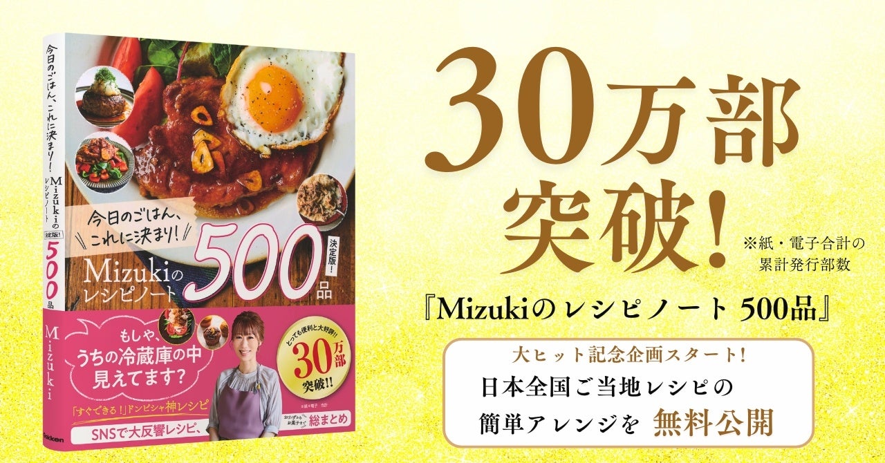 【大ヒット御礼】『Mizukiのレシピノート決定版!500品』が累計発行部数30万部突破! 日本全国ご当地レシピの簡単アレンジを無料公開