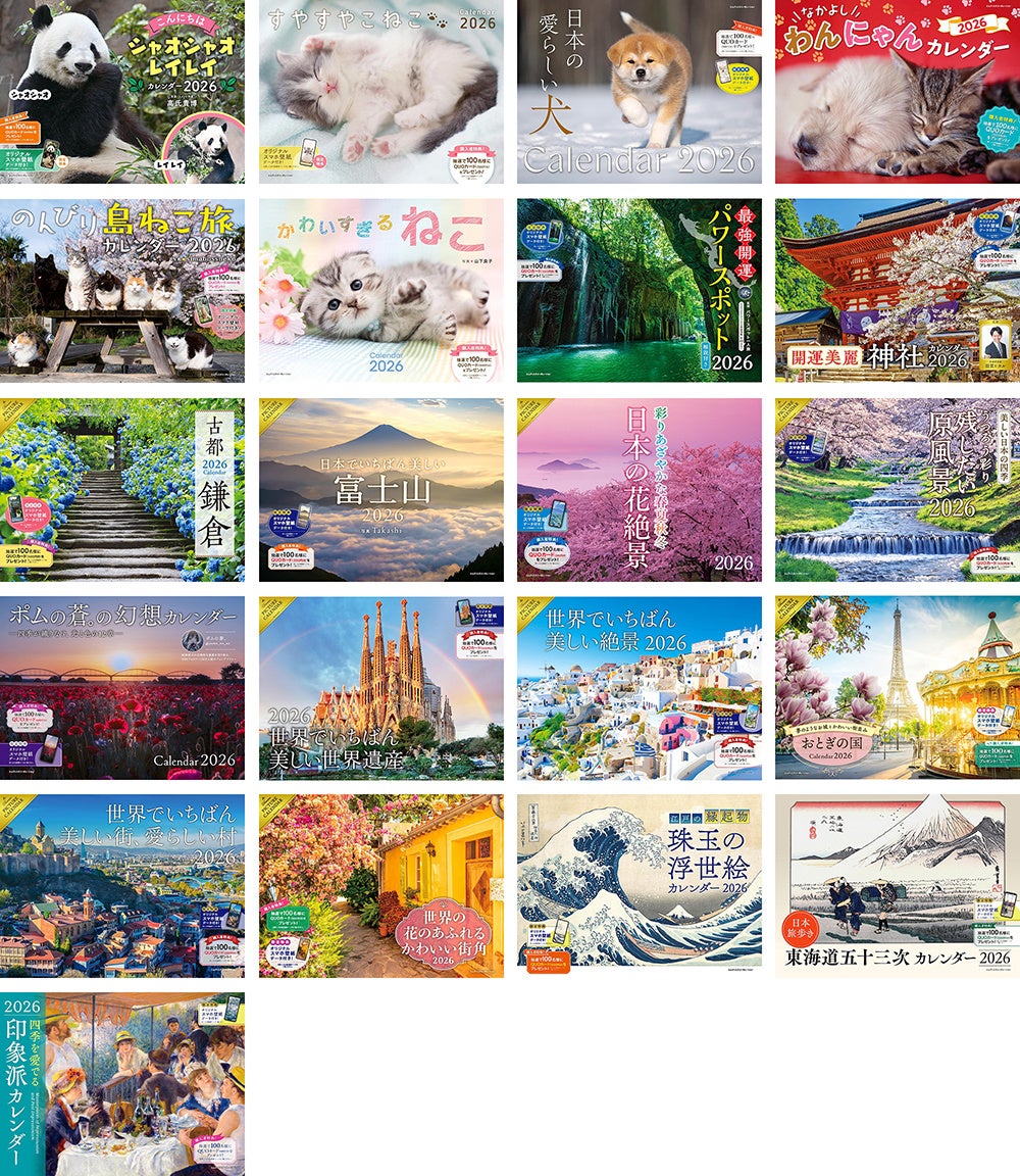 2026年のMdNカレンダーは、多くの人に愛されてきた『2026 世界でいちばん美しい世界遺産カレンダー』や『2026 日本でいちばん美しい富士山カレンダー』、昨年版で大人気を博した「2026 最強開運パワースポットカレンダー」、双子パンダの愛らしい姿をとらえた『2026 こんにちはシャオシャオ・レイレイカレンダー』、アート好きな方に支持されてきた『2026 四季を愛でる印象派カレンダー』など、バラエティ豊かなカレンダーが勢揃い。