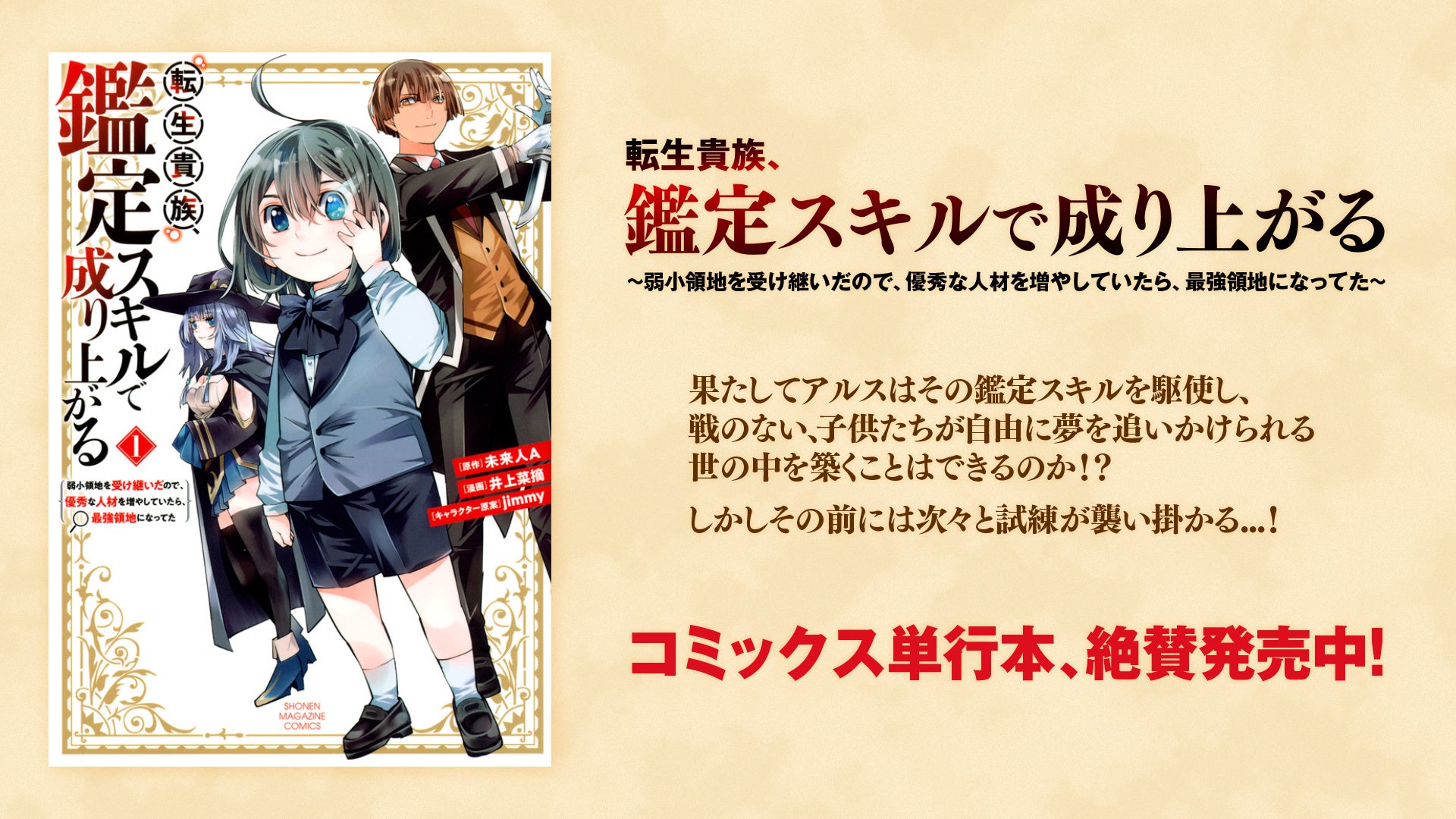 『転生貴族、鑑定スキルで成り上がる』の主人公は、異世界に転生したアルス・ローベント。小さな領地を持つ弱小貴族の子として生きることになったアルス…特別な知力や武力はないが、生まれながらにして他人の能力・ステータスを見抜く“鑑定スキル”を手にしていた!そのスキルを活かして世に隠れた「逸材」を発掘し、弱小領地から最強の領地へと変貌させていく―――⁉心優しいアルスと、個性豊かな逸材たちの出会いと成長を描く異世界統一記が今、始まる‼絶対にお見逃しなく!