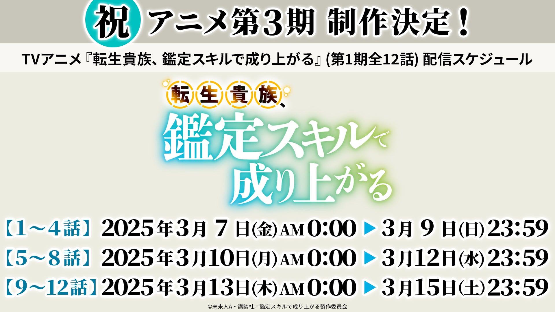 TVアニメ『転生貴族、鑑定スキルで成り上がる』 (第1期全12話) 配信スケジュール