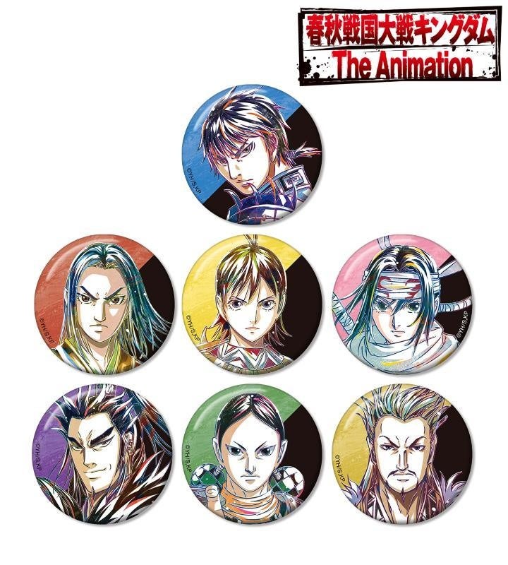 信、嬴政、河了貂、羌瘣、桓騎、慶舎、紀彗のイラストを新たなタッチで魅力的に表現し、缶バッジに仕上げました。