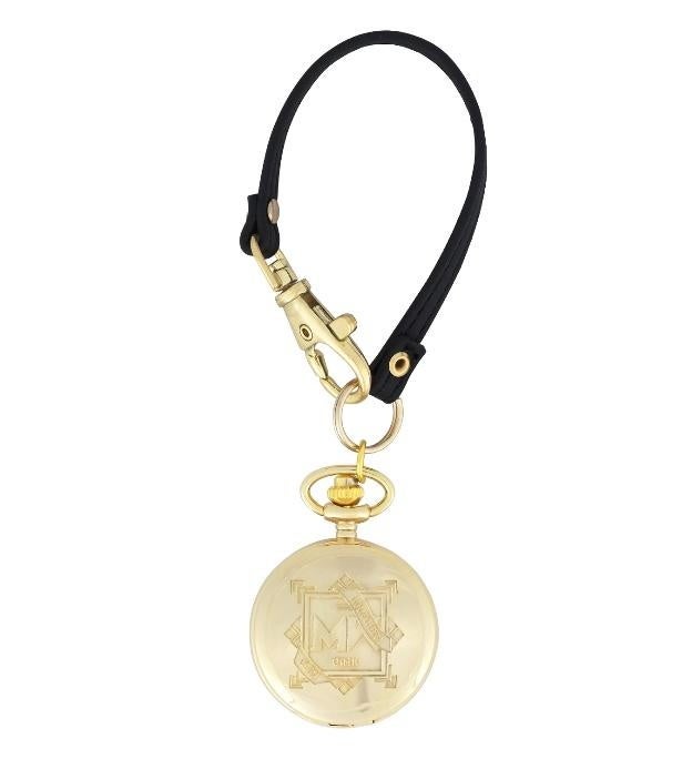 ブラックレザーのストラップのついた懐中時計となっており、幅広い種類のカバンにつけられます。