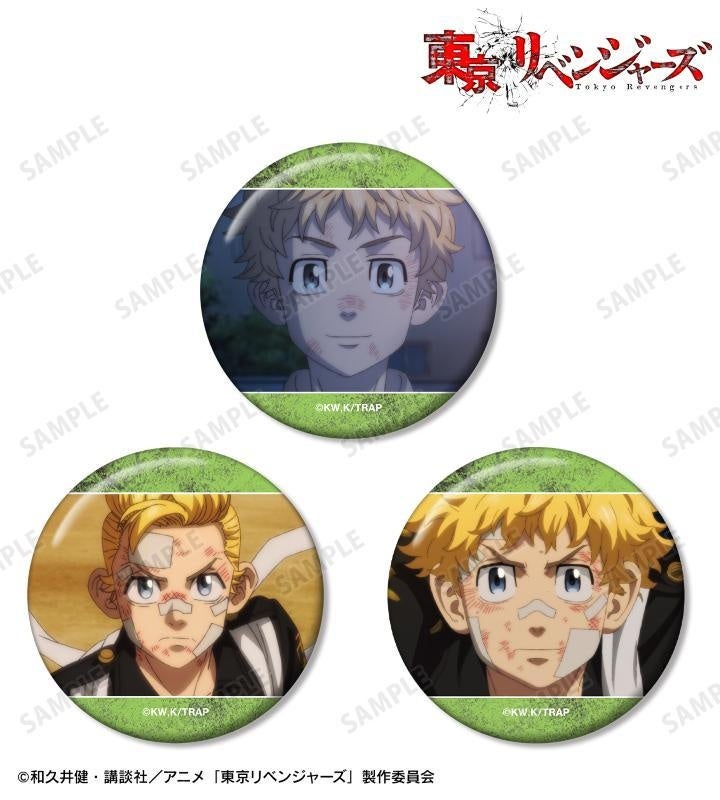 花垣 武道、佐野 万次郎、松野 千冬、三途 春千夜、灰谷 蘭、灰谷 竜胆、黒川 イザナの印象的なシーンをキャラクターカラーに併せた缶バッジ3個セットに仕上げました。