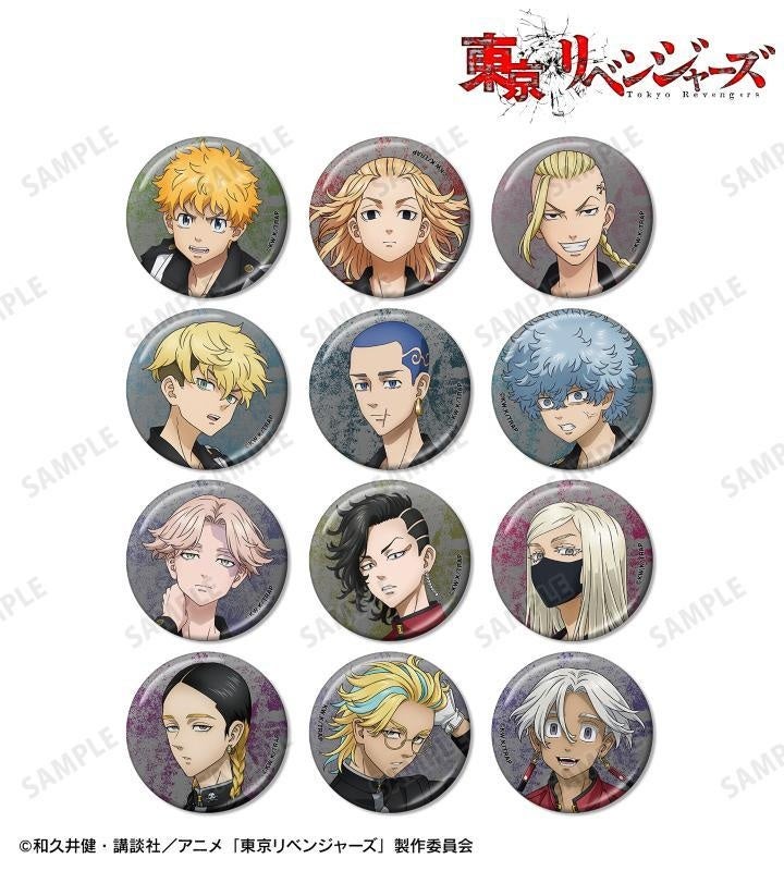 花垣 武道、佐野 万次郎、龍宮寺 堅、松野 千冬、柴 八戒、河田 ソウヤ、乾 青宗、九井 一、三途 春千夜、灰谷 蘭、灰谷 竜胆、黒川 イザナのイラストをキャラクターカラーに併せたメタリック仕様の缶バッジに仕上げました。