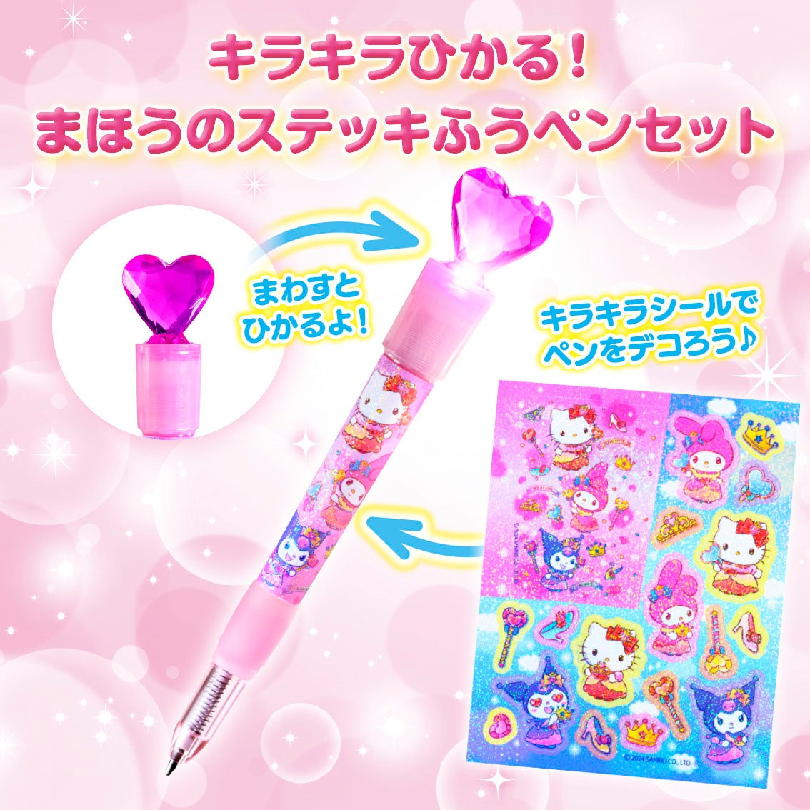ペンは、軸を回すとキラっとかがやくハートモチーフがポイント!