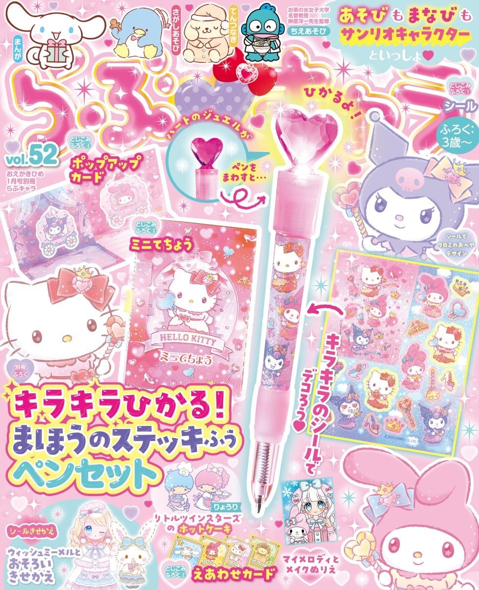 サンリオキャラクターといっしょに遊んで学べる雑誌『らぶキャラ』。今号のふろくは「キラキラひかる! まほうのステッキふうペンセット」!!