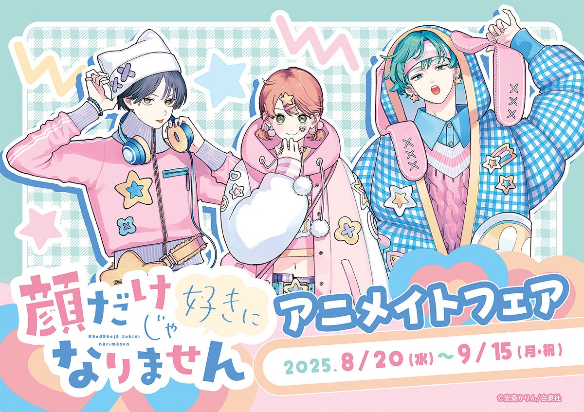 株式会社アニメイトは、『顔だけじゃ好きになりません』の描き下ろしイラストを使用した新商品を、2025年8月20日から発売いたします。また、同日より【『顔だけじゃ好きになりません』アニメイトフェア】を開催いたします。
