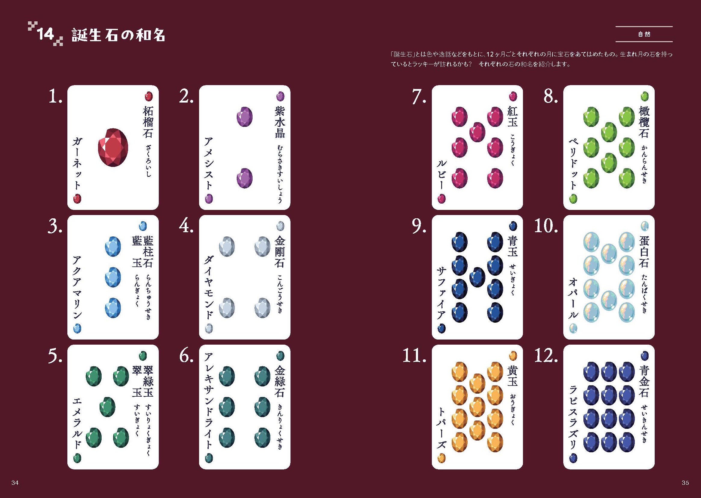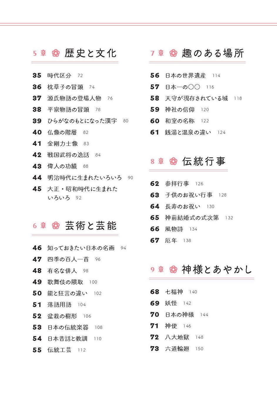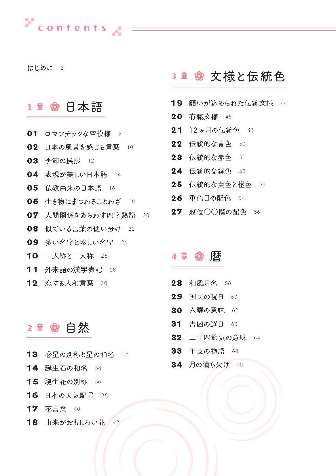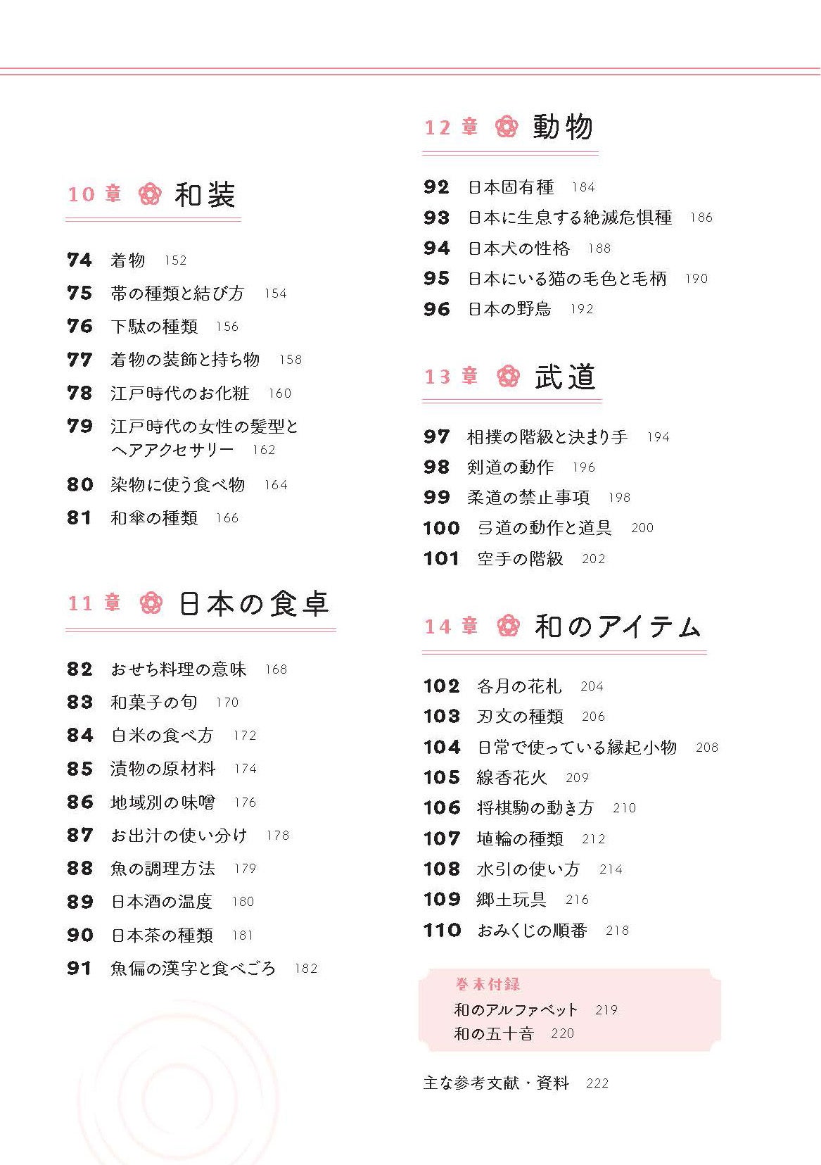 1章:日本語 / 2章:自然 / 3章:文様と伝統色 / 4章:暦 / 5章:歴史と文化 / 6章:芸術と芸能 / 7章:趣のある場所 / 8章:伝統行事 / 9章:神様とあかし / 10章:和装 / 11章:日本の食卓 / 12章:動物 / 13章:武道 / 14章:和のアイテム