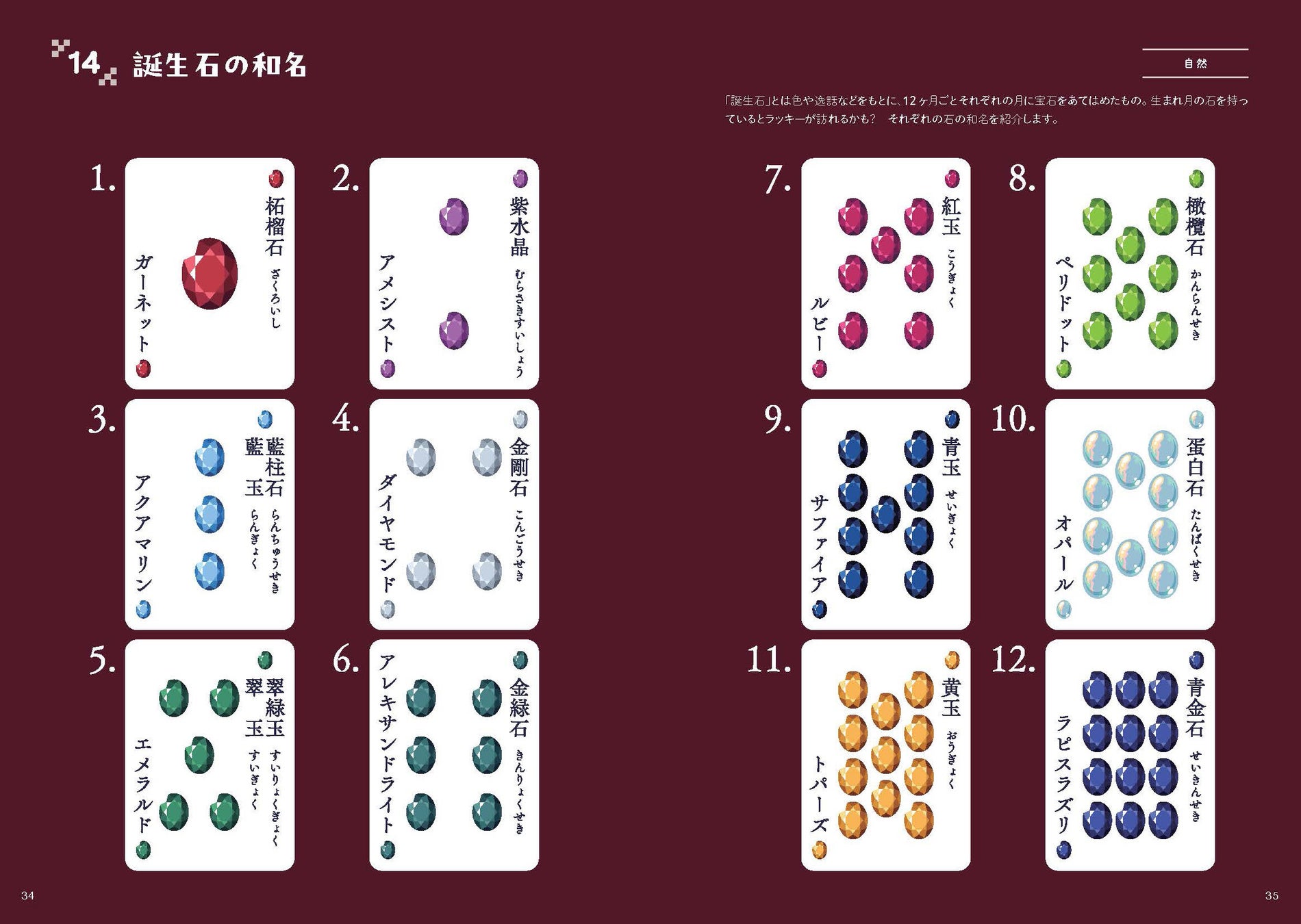 ■「誕生石の和名×トランプ」、「将棋の駒の動き×バタートースト」、「空模様の言葉×窓辺」など、雑学と様々なモチーフを組み合わせたイラスト図解を眺めているだけで楽しめる!