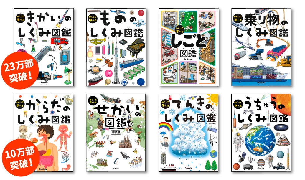 理系脳を育てる“しくみが見えて、わかる”シリーズです。「きかいのしくみ図鑑」「もののしくみ図鑑」「しごと図鑑」「乗り物のしくみ図鑑」「からだのしくみ図鑑」「せかいの図鑑 新装版」「てんきのしくみ図鑑」「うちゅうのしくみ図鑑」の8冊が発売中です。続刊予定。