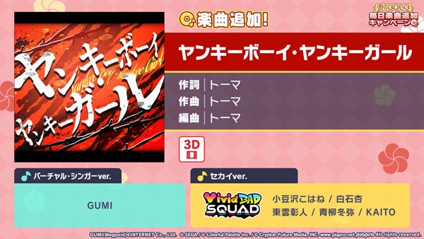 KAITOと「Vivid BAD SQUAD」が歌うセカイver.と、GUMIが歌うバーチャル・シンガーver.の2つの音源でプレイが可能です。
