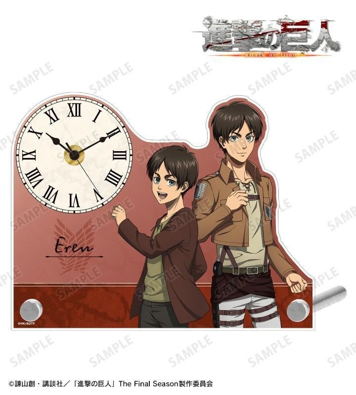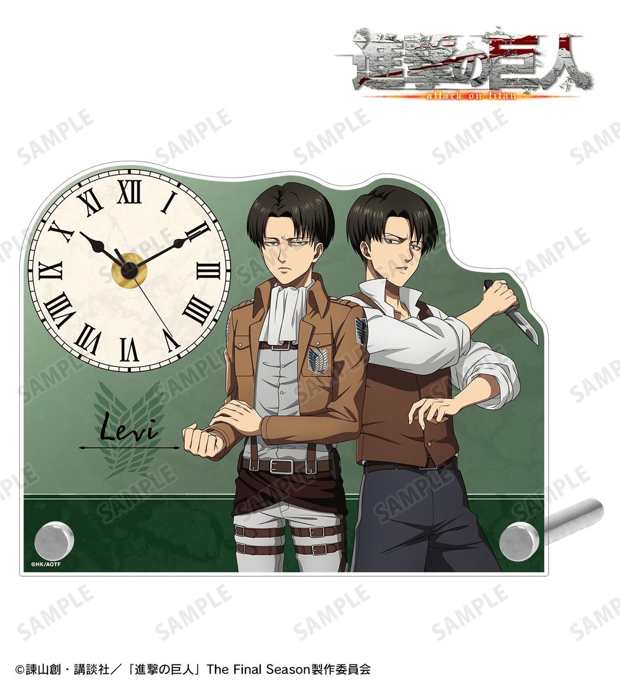エレン、リヴァイの描き下ろしイラスト、キャラクターの名前をデザインしたアクリルスタンド時計です。