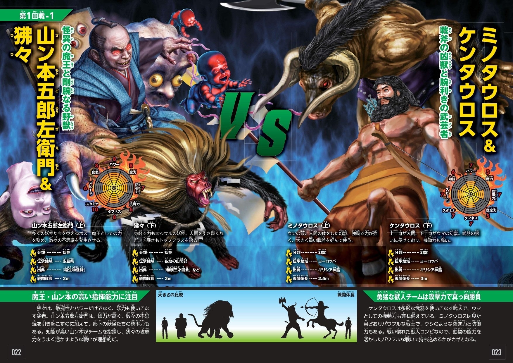 幻獣、妖怪がタッグを組んだ! 酒呑童子、だいだらぼっち、ミノタウロス、フロストジャイアント……『妖怪最強王図鑑』、『幻獣最強王図鑑』でおなじみのメンツはもちろん、新たな幻獣、妖怪も加わり大波乱の予感!!!