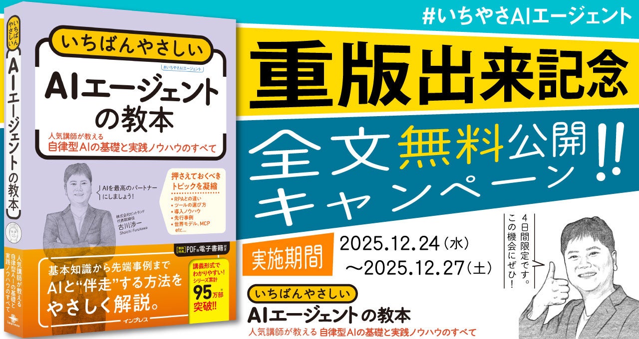 『いちばんやさしいAIエージェントの教本 人気講師が教える自律型AIの基礎と実践ノウハウのすべて』重版出来を記念し、4日間限定の全文無料公開キャンペーンを2025年12月24日より実施