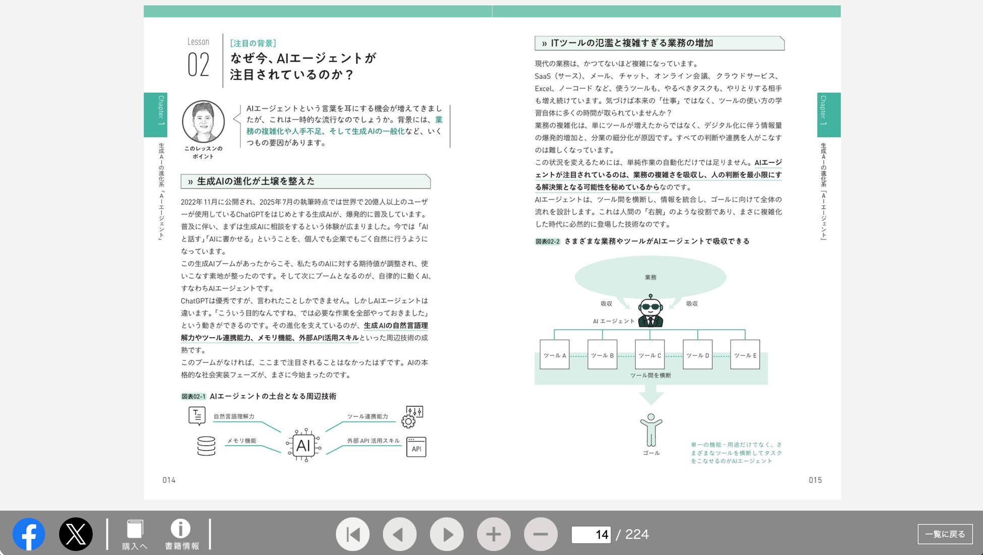 書籍内容の提供には、自社開発の「インプレスWebブックビューアー」を使用します。Webブラウザーで紙面を閲覧できるので、場所や時間を選ばずにPCやスマートフォンなどから登録不要で利用できます。また、SNSで書籍の情報を共有したり、書籍の購入や詳細を確認したりできる機能も備えています。