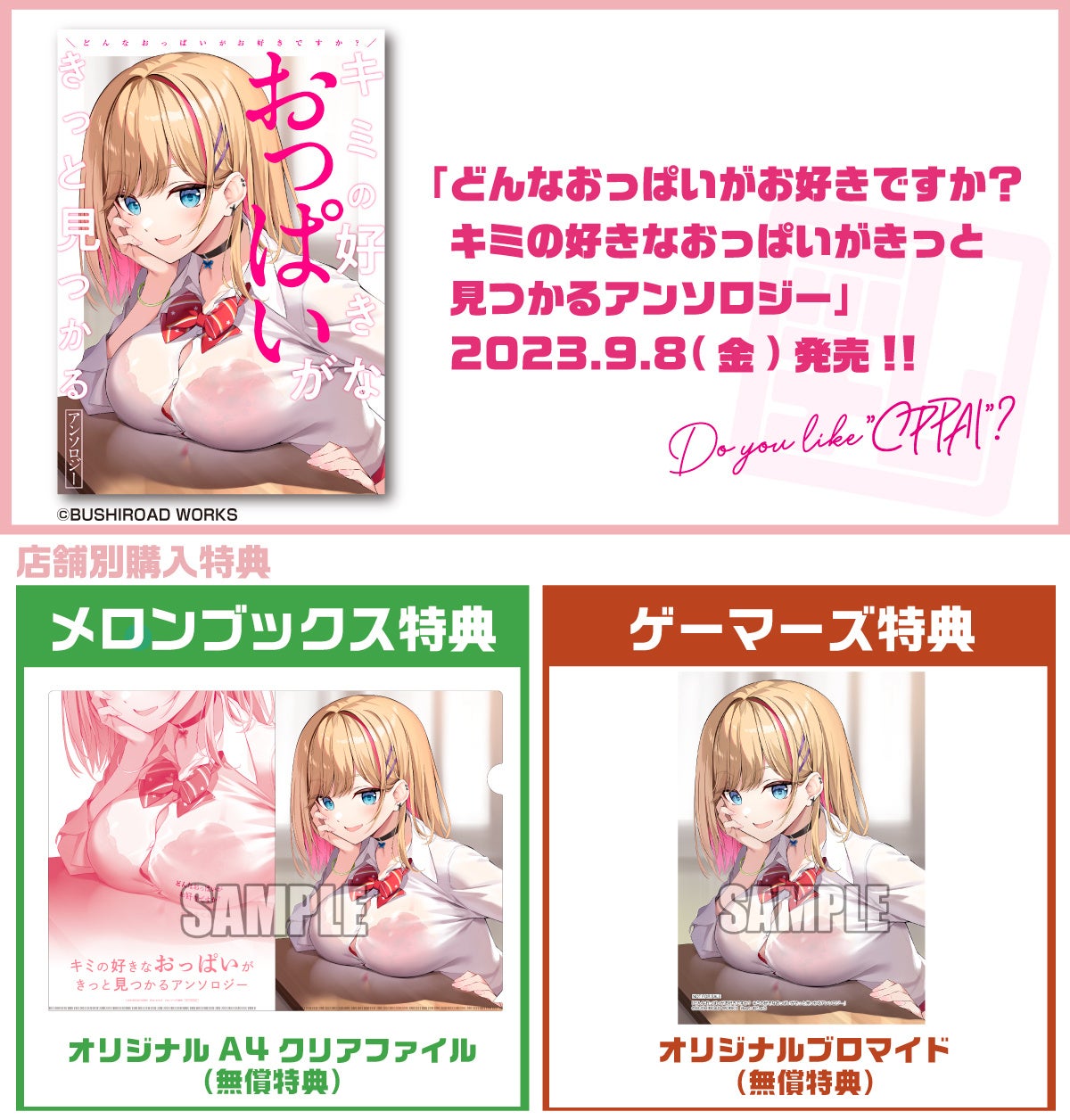 株式会社ブシロード(本社:東京都中野区、代表取締役社⻑:木谷高明)のグループ会社にあたる株式会社ブシロードワークス(本社:東京都中野区、代表取締役社長:新福恭平)は、オリジナルアンソロジー『どんなおっぱいがお好きですか? キミの好きなおっぱいがきっと見つかるアンソロジー』が本日9月8日(金)に発売することをご案内致します。