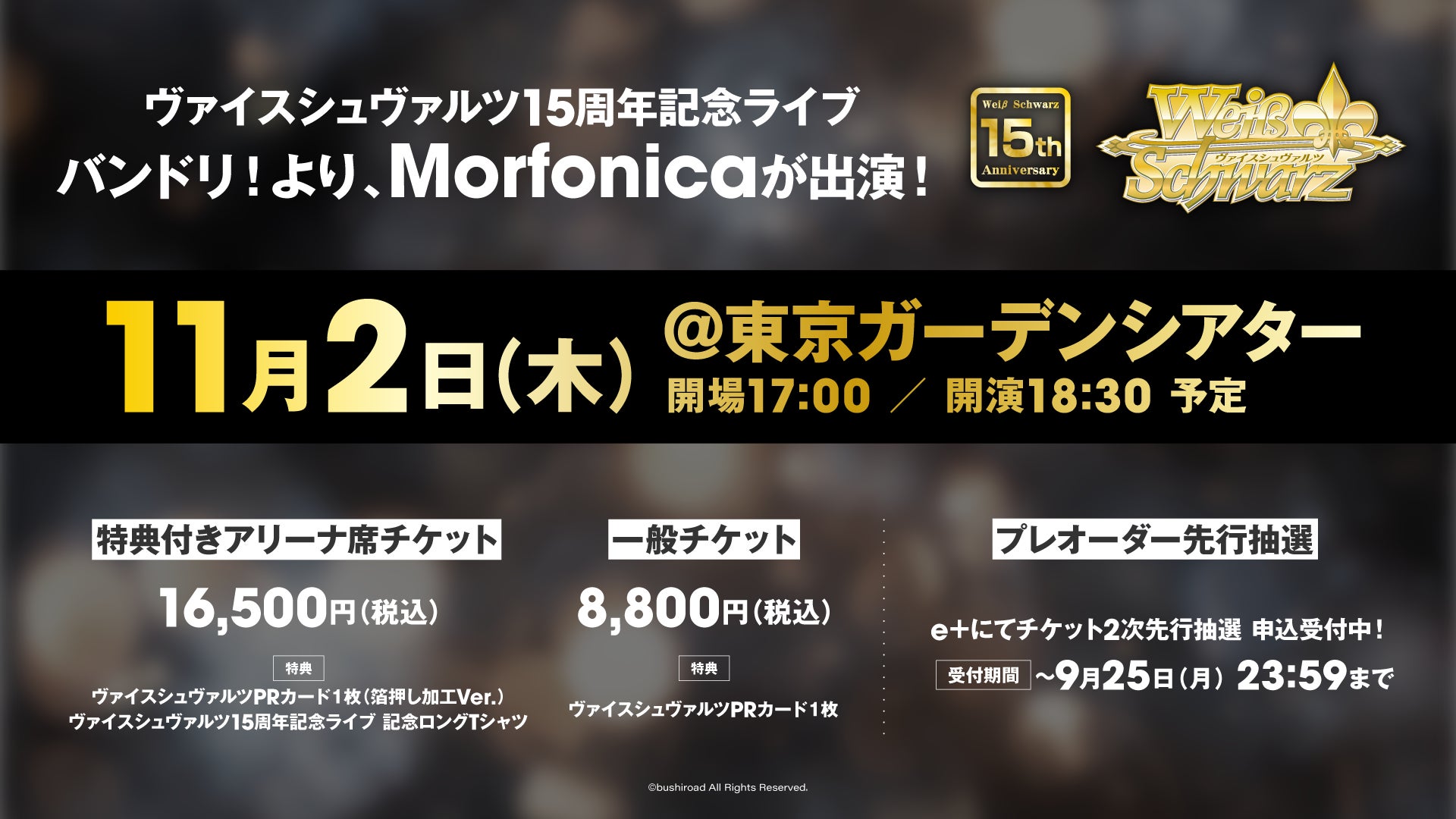 2023年11月2日(木)開催「ヴァイスシュヴァルツ15周年記念ライブ」に、バンドリ!プロジェクトより、Morfonicaが出演します。現在、チケットのプレイガイド先行を受付中です。