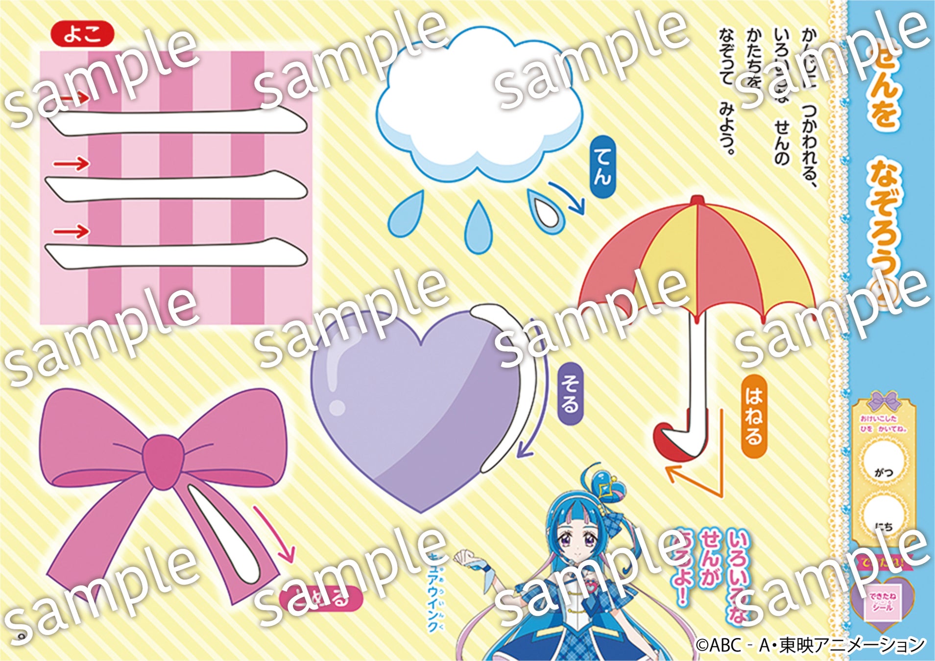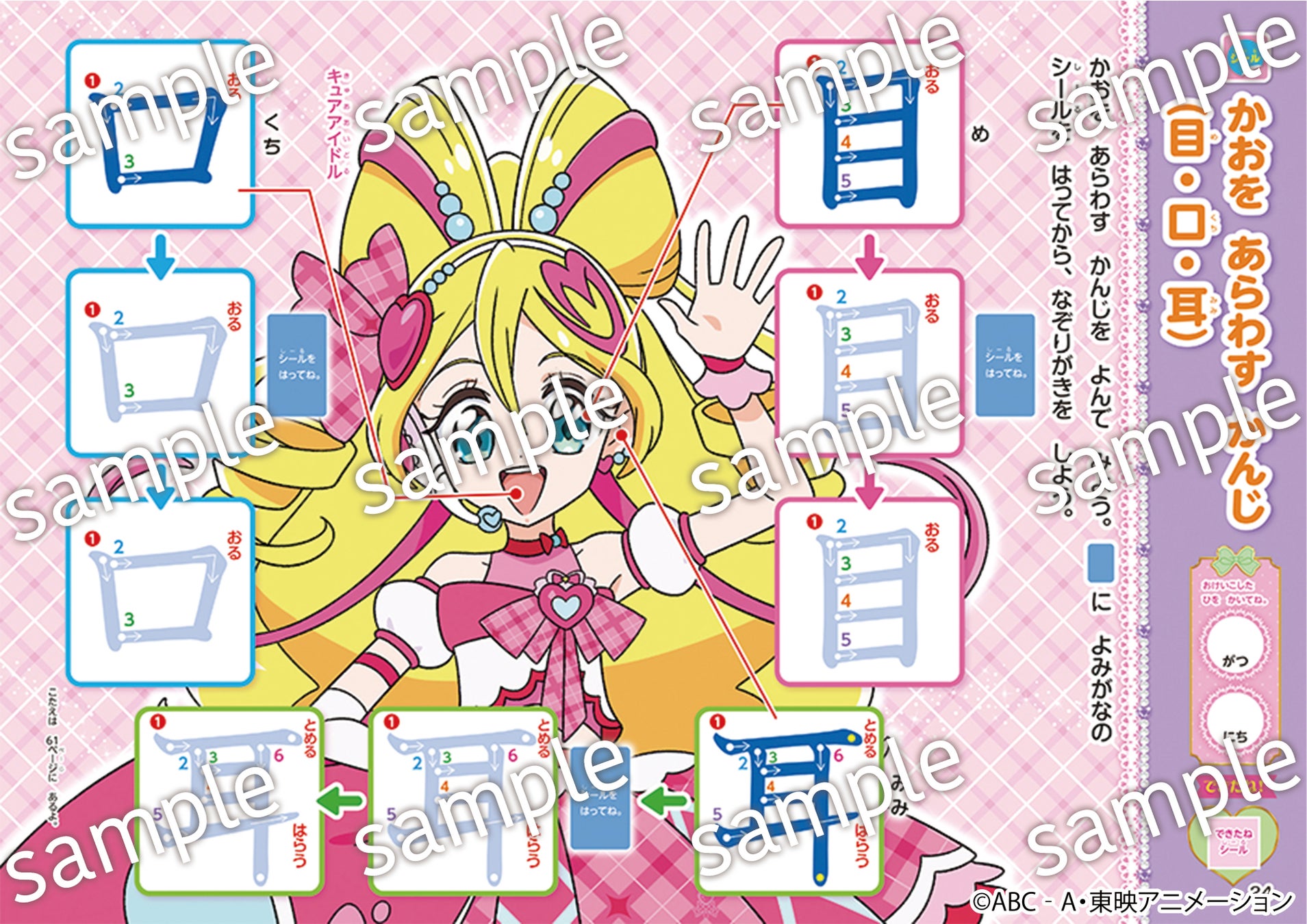 線の種類の運筆練習から始まり、数の漢字、「手・足・口・目」など体や顔のパーツの漢字「木・森」などの自然を表す漢字など、プリキュアのイラストと一緒に楽しく覚えることができます。