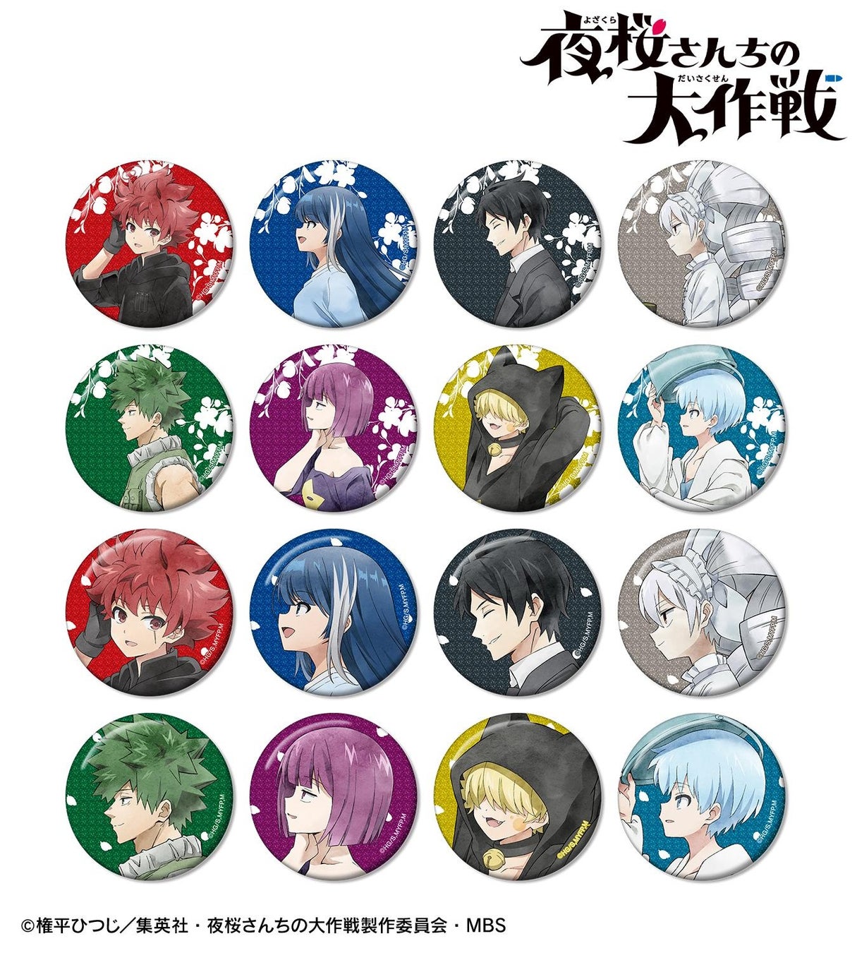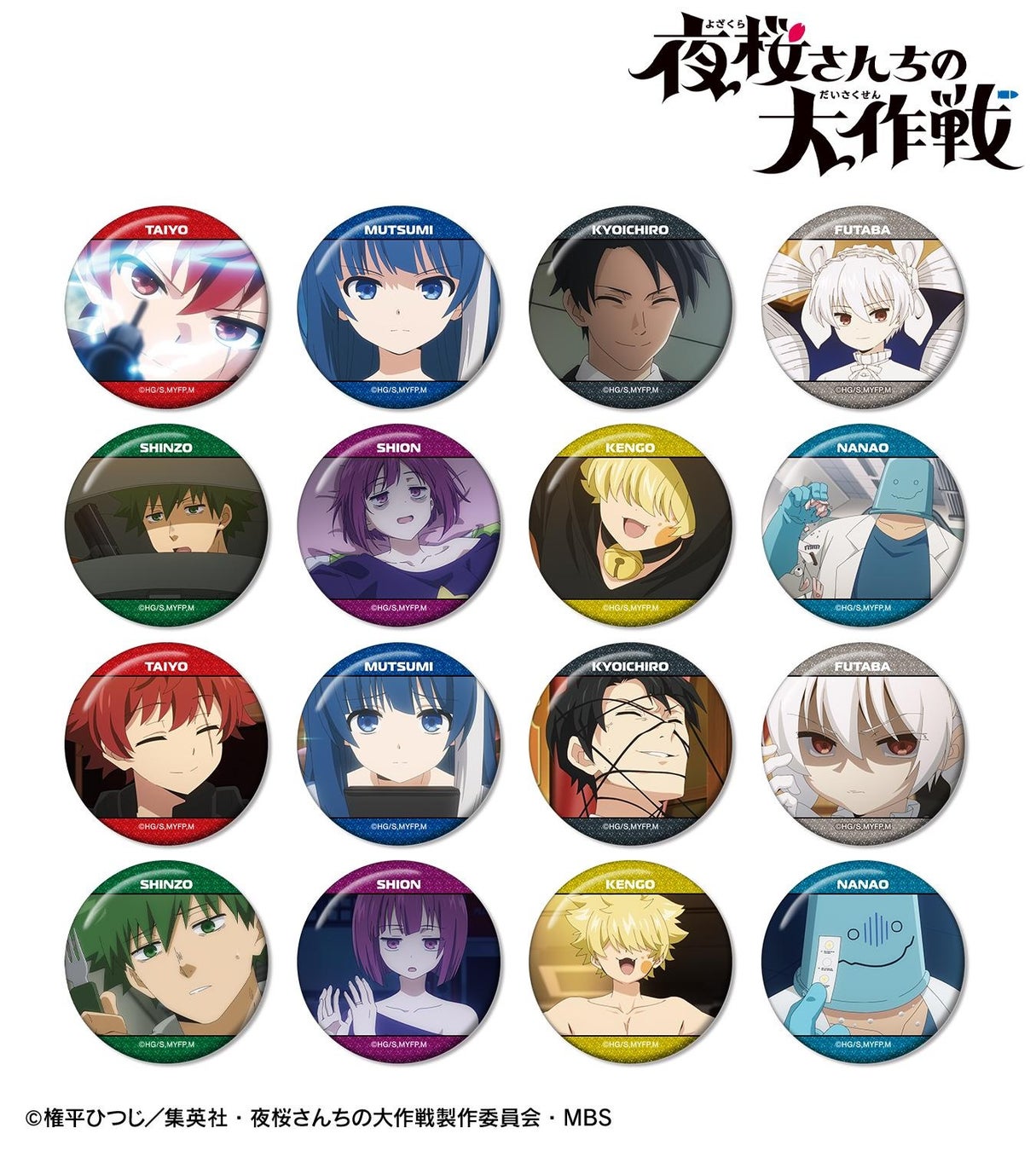 朝野太陽、夜桜六美、夜桜凶一郎、夜桜二刃、夜桜辛三、夜桜四怨、夜桜嫌五、夜桜七悪の印象的なシーンをグリッター加工を施した缶バッジに仕上げました。
