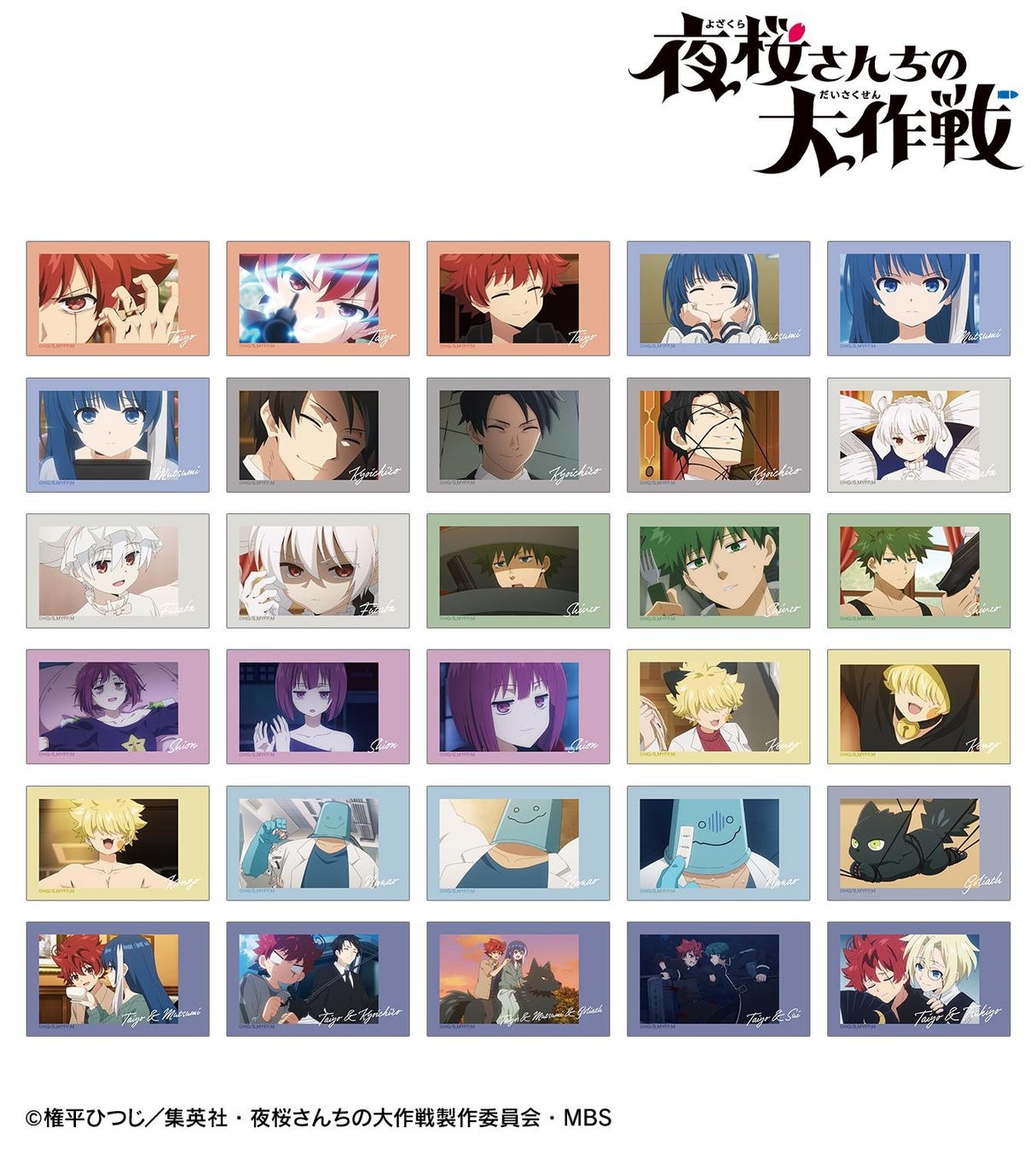 朝野太陽、夜桜六美、夜桜凶一郎、夜桜二刃、夜桜辛三、夜桜四怨、夜桜嫌五、夜桜七悪、ゴリアテ、蒼翠、星降月夜の印象的なシーンをインスタントカメラ風のイラストカードに仕上げました。