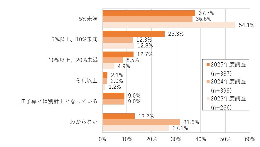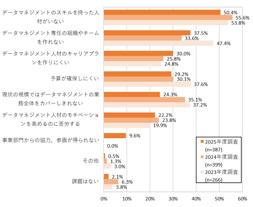 生成AIの活用に向けてデータの整備を強化したいというモチベーションが高まる中で、データマネジメントに対する企業の本気度、優先度がどの程度変化しているかを、企業内で取り組まれる施策の優先順位が最も端的に現れる予算配分で見てみました。IT投資予算に占めるデータマネジメントへの投資比率を見ると、2024年度と同様に「5%未満」の企業が最も多く37.7%を占めていますが、「5%以上10%未満」と回答した企業が2024年度の15.3%に対し2025年度は25.3%と大きく増加しています。また、データマネジメントに関する人材や組織の課題として「予算が確保しにくい」を上げた企業は過去2年間では連続して3割を超えていましたが、2025年度は29.2%とはじめて20%台となり、データマネジメントへの投資は、まだ配分比率が多いとはいえないものの、少しずつ上向いているようです。
