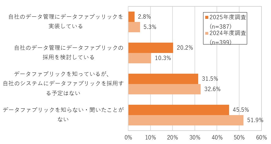 分散したデータを統合して活用する手法として、データを予め結合し蓄積すること無くリアルタイムで様々なデータを連携・統合して活用できる環境である、データメッシュとデータファブリックへの期待が高まっています。今回の調査でも、「データメッシュの採用を検討している」企業は2024年度の10.8%から23.8%へ倍増しており、「データファブリックの採用を検討している」企業も2024年度の10.3%から20.2%へと、こちらも倍増しています。