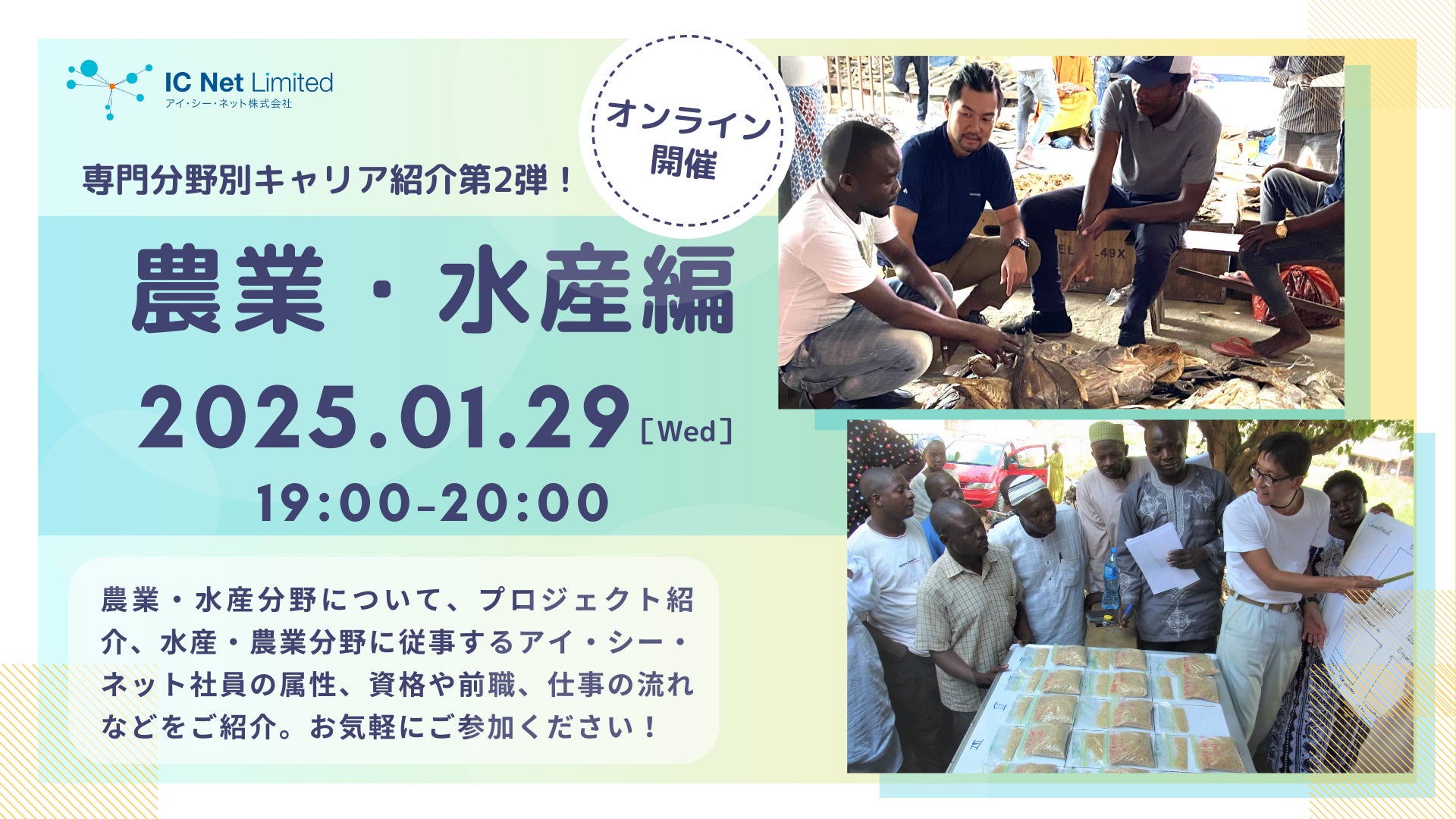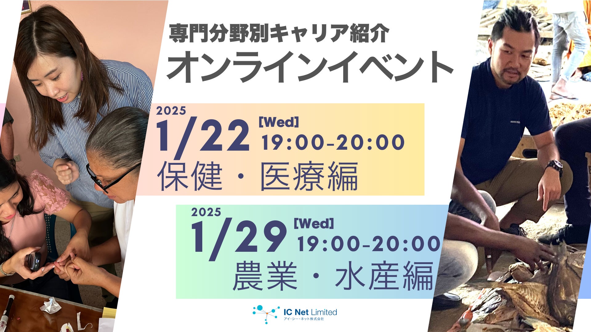 開発コンサルタントは、専門性の有無や、修士の取得と開発途上国での経験が必須というイメージがあり、誰でも挑戦できる仕事ではないという声が聞かれます。本当に専門性が必要なのか、限られた経験しか活用できないのか、などの疑問を解決していただくためにオンラインイベントを開催します。アイ・シー・ネットは20の専門分野でプロジェクトを実施しています。その中でも、さまざまな経験が生かせる「保健・医療」と「農業」「水産」の分野に焦点をあてて紹介します。