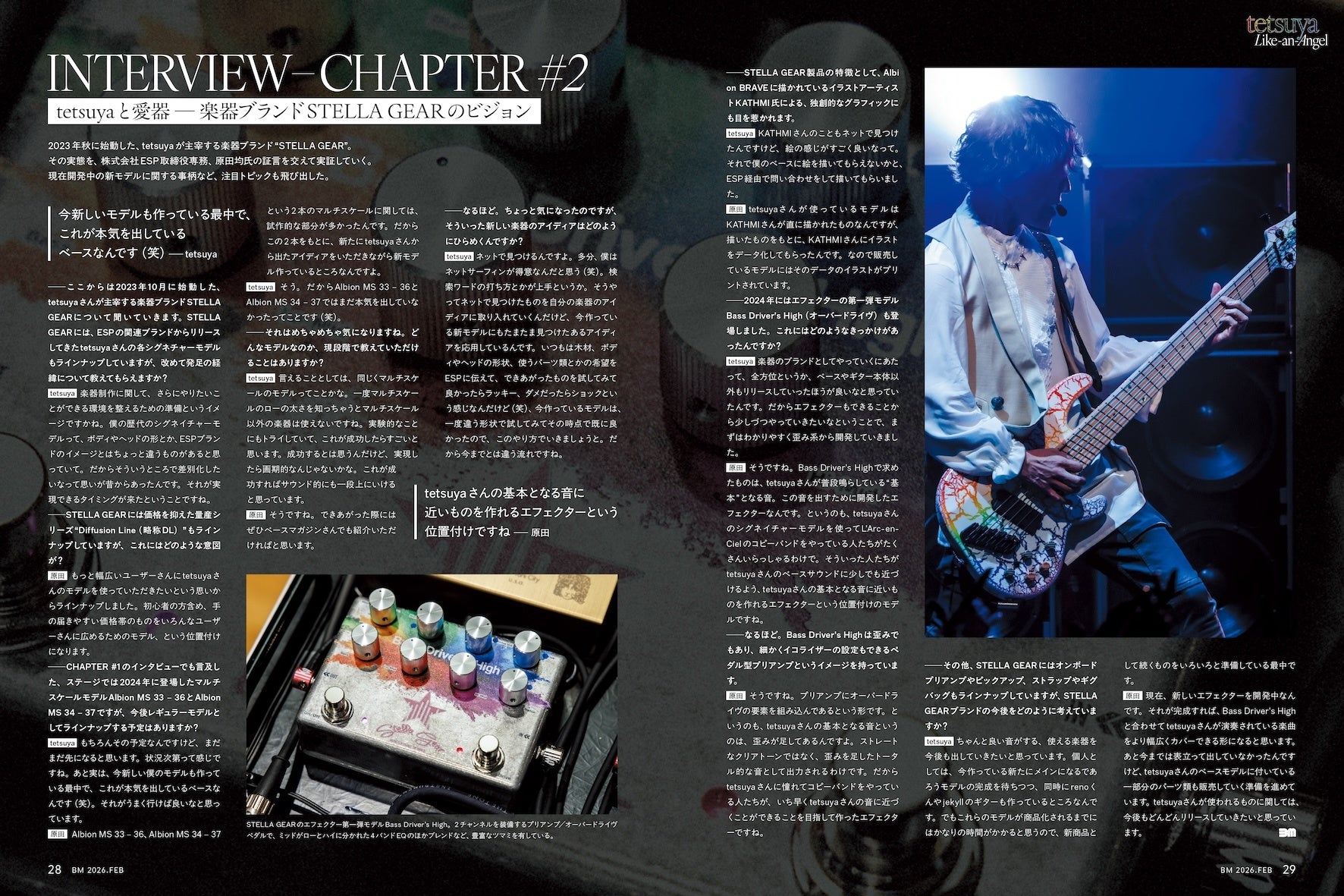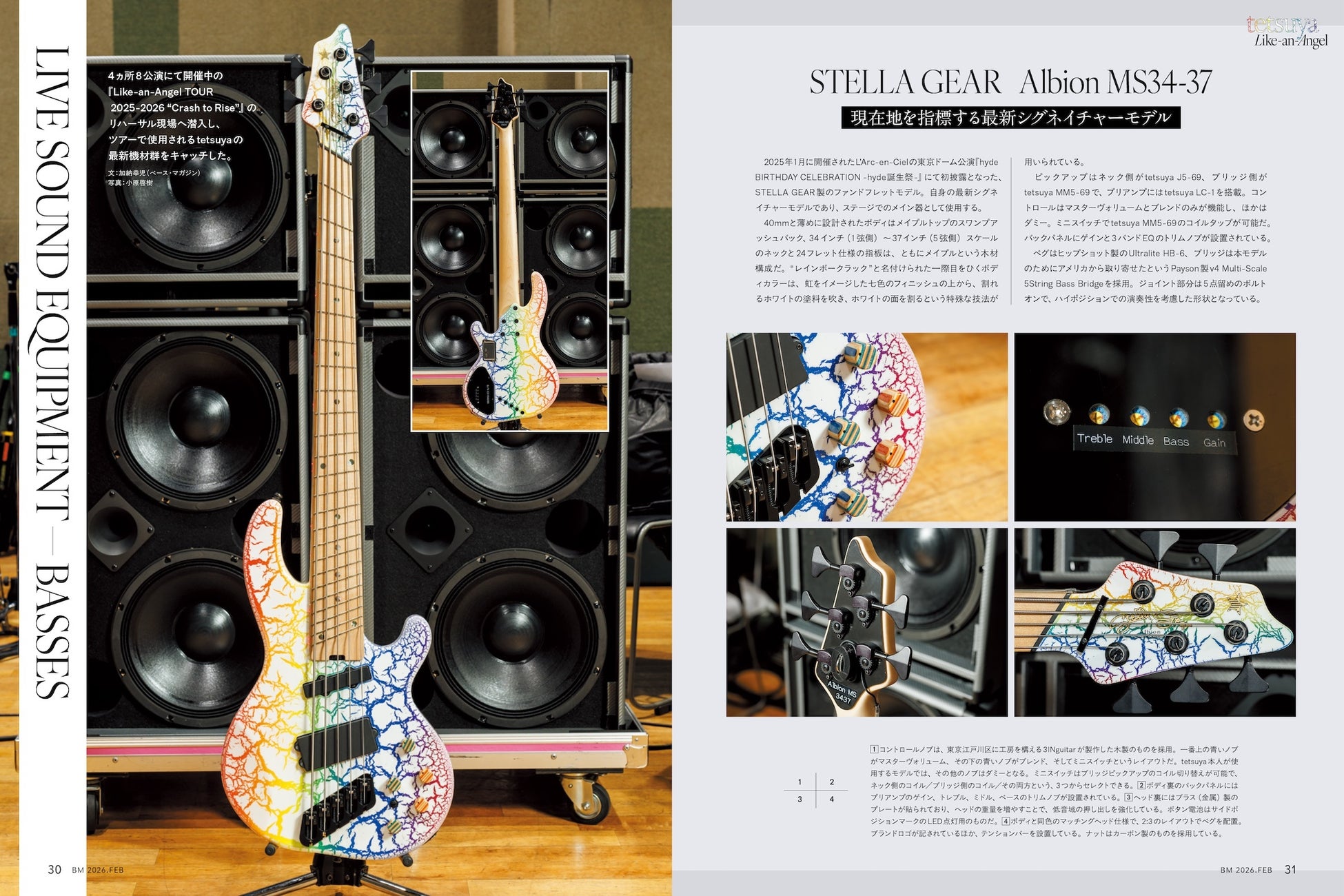 Like-an-Angelの中心人物としてはもちろん、ベースシーンのパイオニアとして圧倒的な存在感を放ち続けるtetsuyaは、“ライク”にどのような思いを抱き、自身の未来図をどのように描いているのか。およそ14年ぶりとなる本誌表紙登場を機に、ロング・インタビューや使用機材、自身が展開する楽器ブランドSTELLA GEARについてなど、多方面からtetsuyaの最新モードを検証していきます。