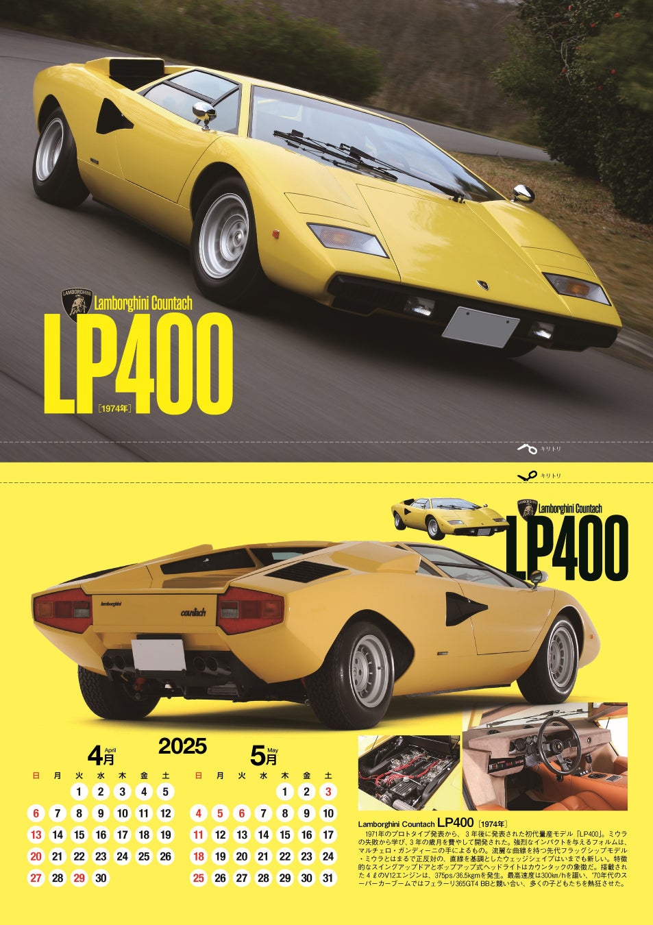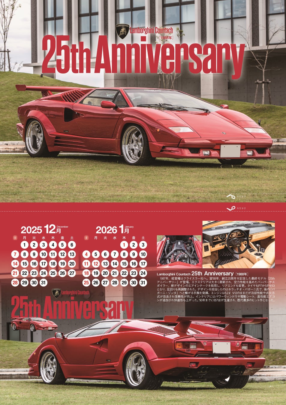 カレンダーでは、量産最初期の1974年式「LP400」から、最終モデルである1988年式「25thアニバーサリー」までの純正5モデルを網羅。さらに、石油王ウォルター・ウルフ氏特注の「ウルフ・カウンタック」、謎多き一台である「LP500R」の2台も加え、全7モデルのカウンタックのピンナップが楽しめる豪華仕様となっている。